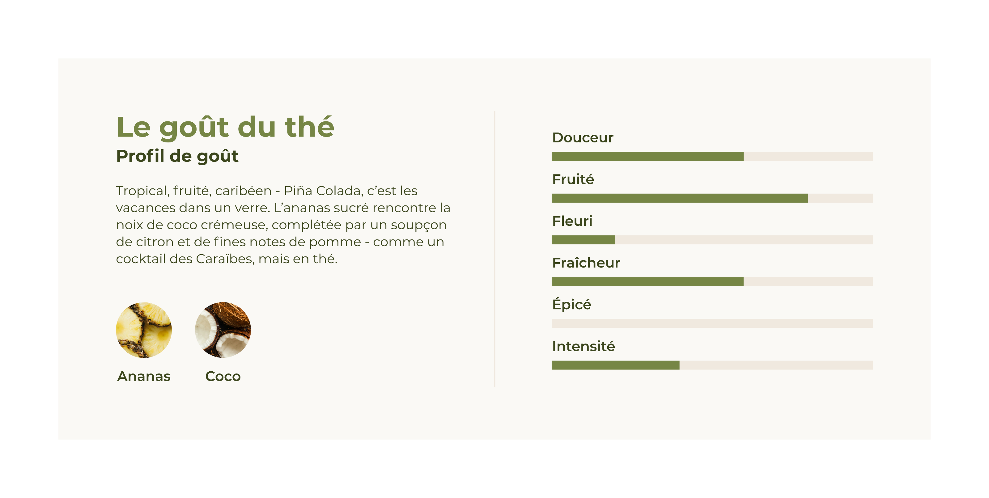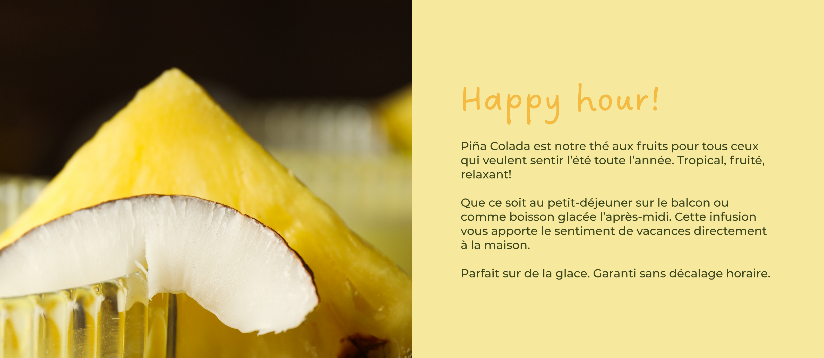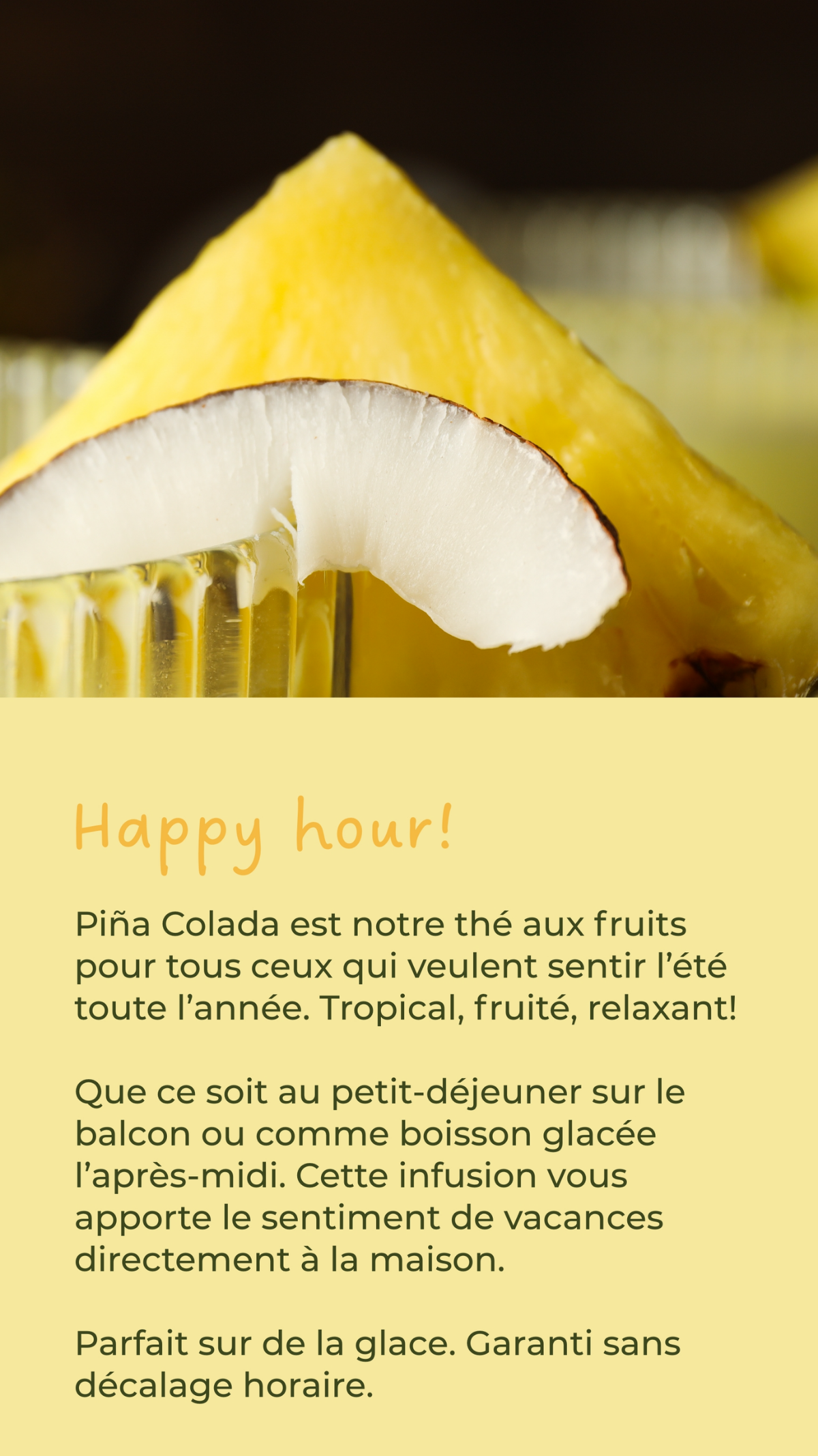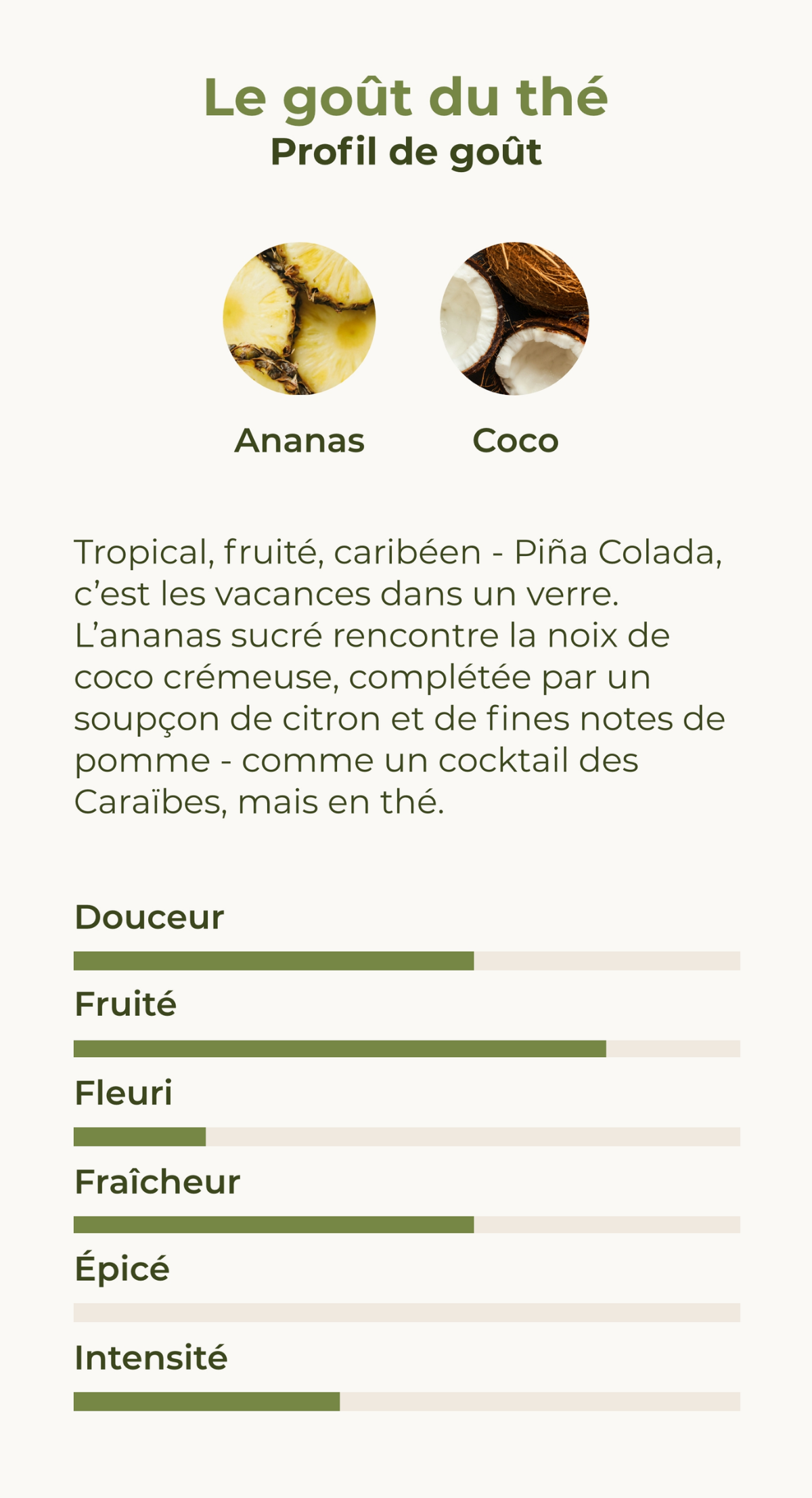 Rêvez à la plage avec Piña Colada, notre mélange de thé aux fruits exotiques avec ananas, noix de coco et morceaux de pomme. Inspiré du cocktail mondialement connu, sans alcool.