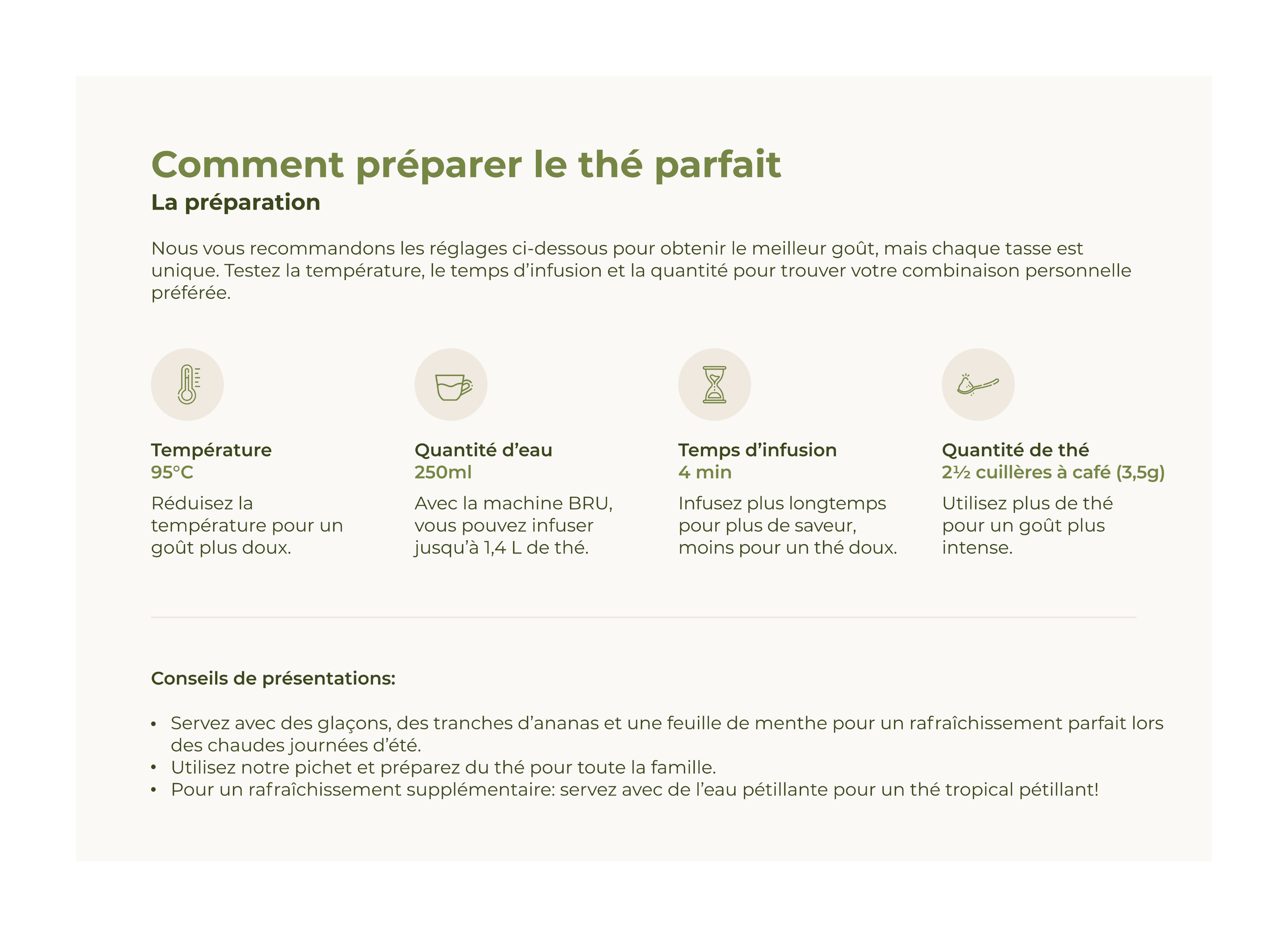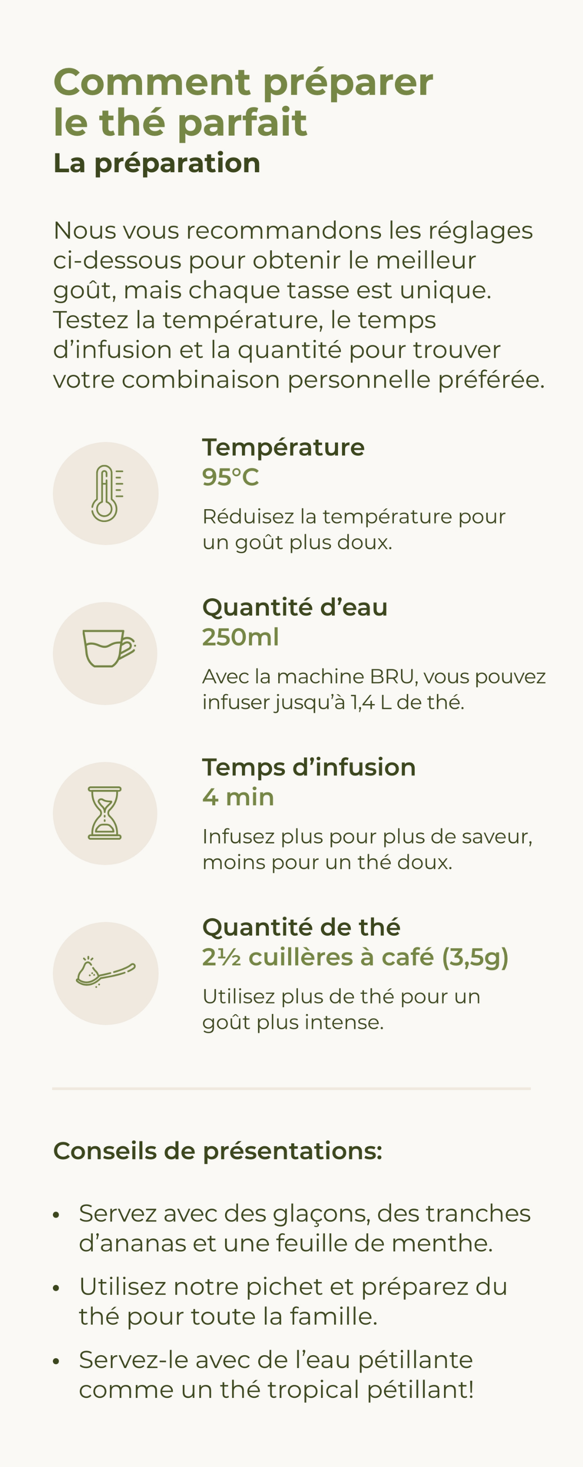 Un thé glacé frais et fruité avec un air de vacances. Parfait sur de la glace ou chaud si vous voulez faire entrer l'été dans votre tasse.