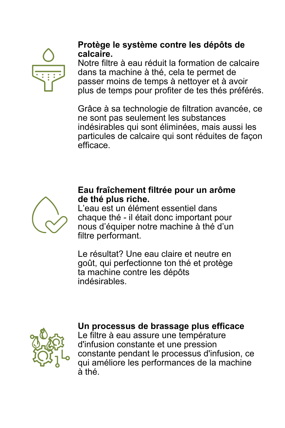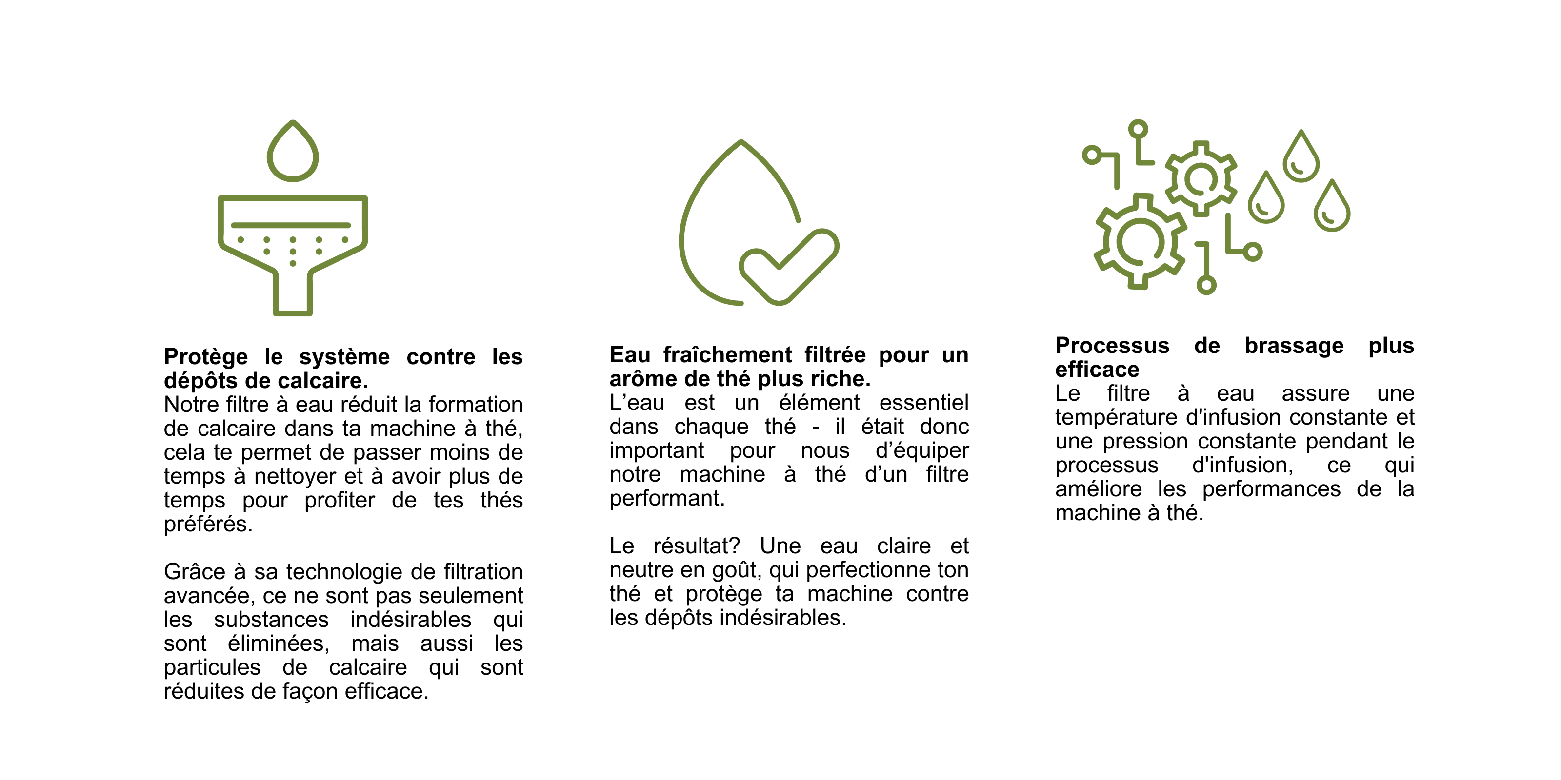• De l'eau fraîchement filtrée pour un arôme de thé plus riche