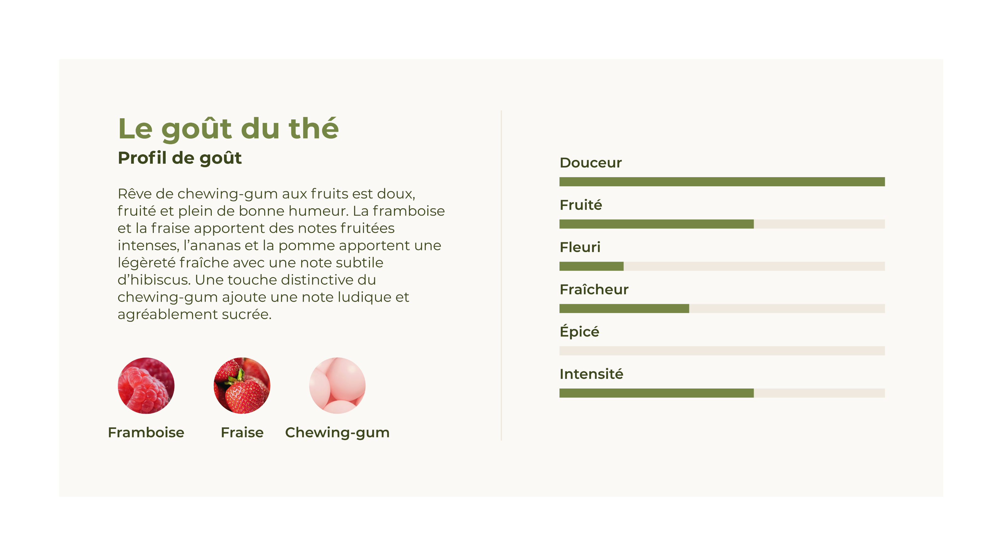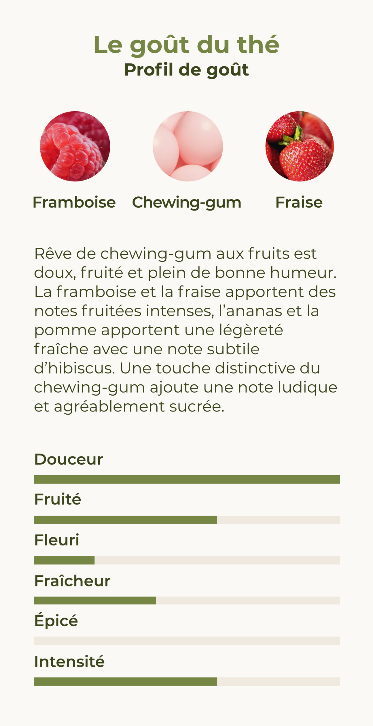 Bienvenue dans la nostalgie de l’enfance avec les fameux chewing-gums aux fruits : un mélange de thé aux fruits qui réveille les souvenirs d'enfance. La framboise fruitée, l'ananas sucré, la carotte violette et un soupçon de fraise se fondent en un goût qui vous fera sourire de nostalgie.