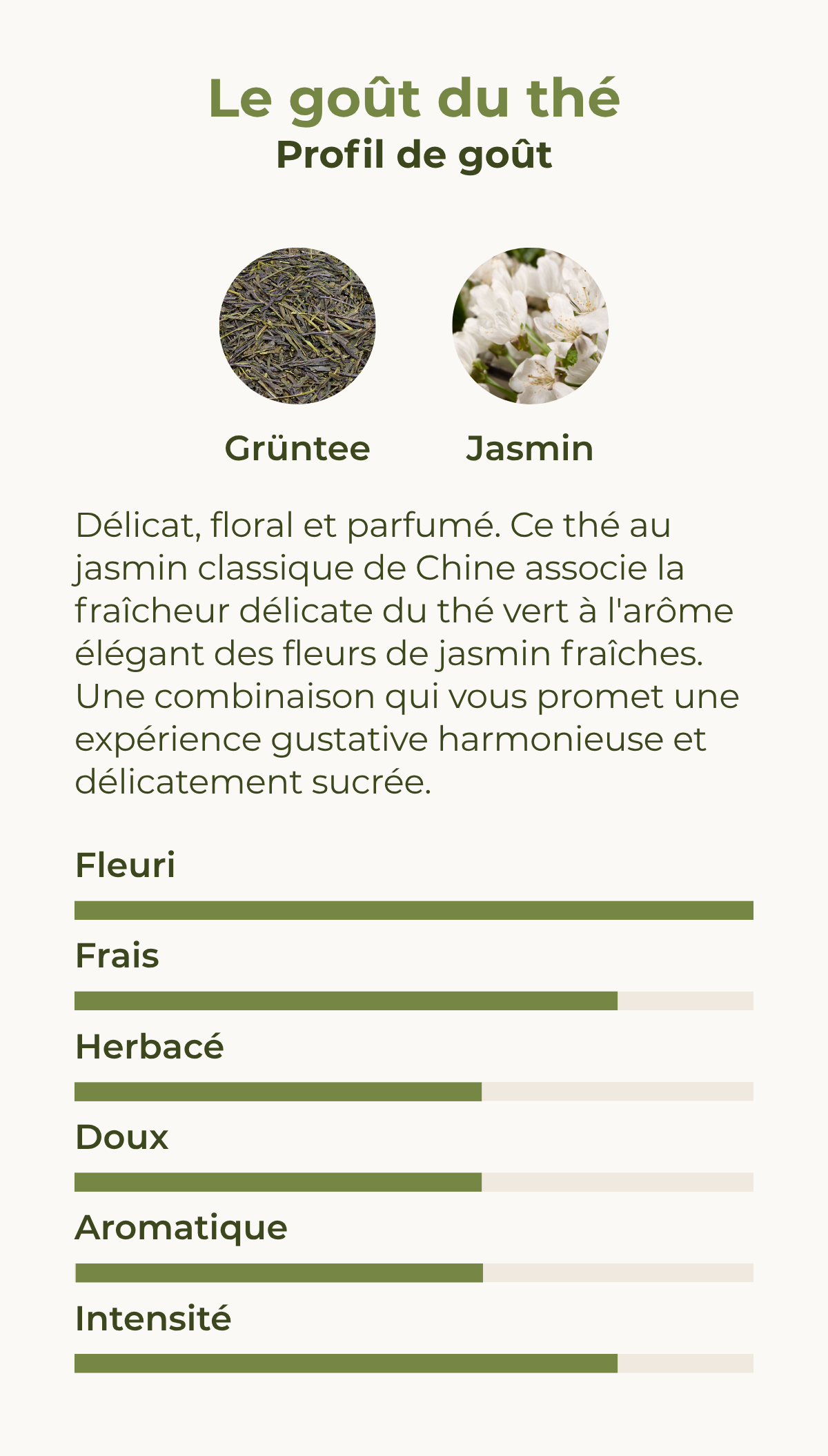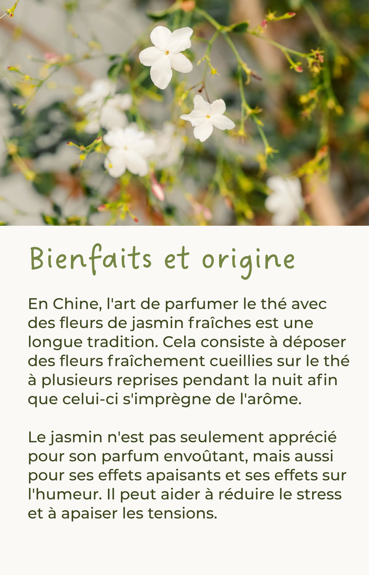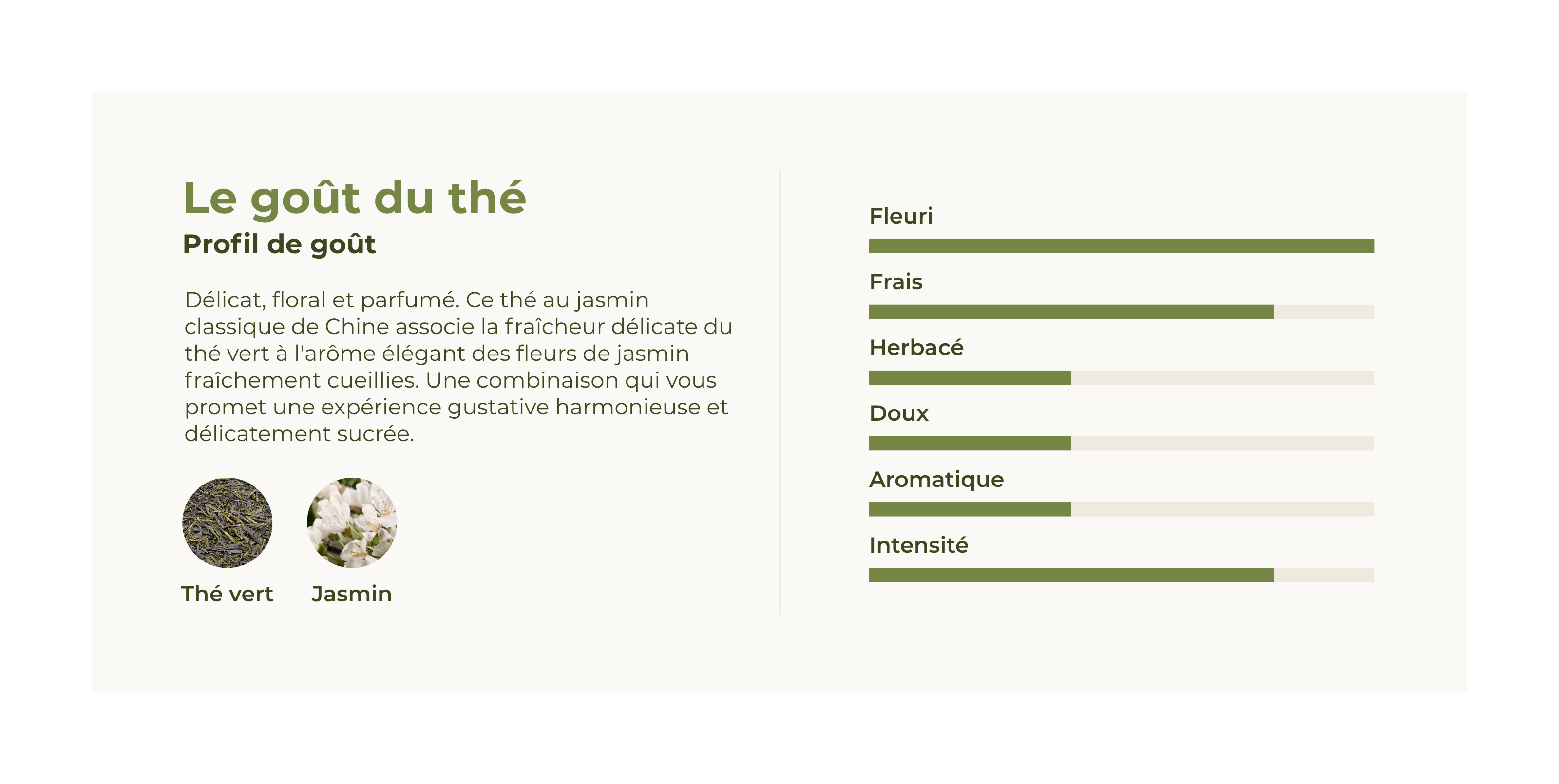 Le thé vert et l'essence délicate de la fleur de jasmin se fondent dans notre thé au jasmin pour créer une expérience olfactive et gustative particulière.