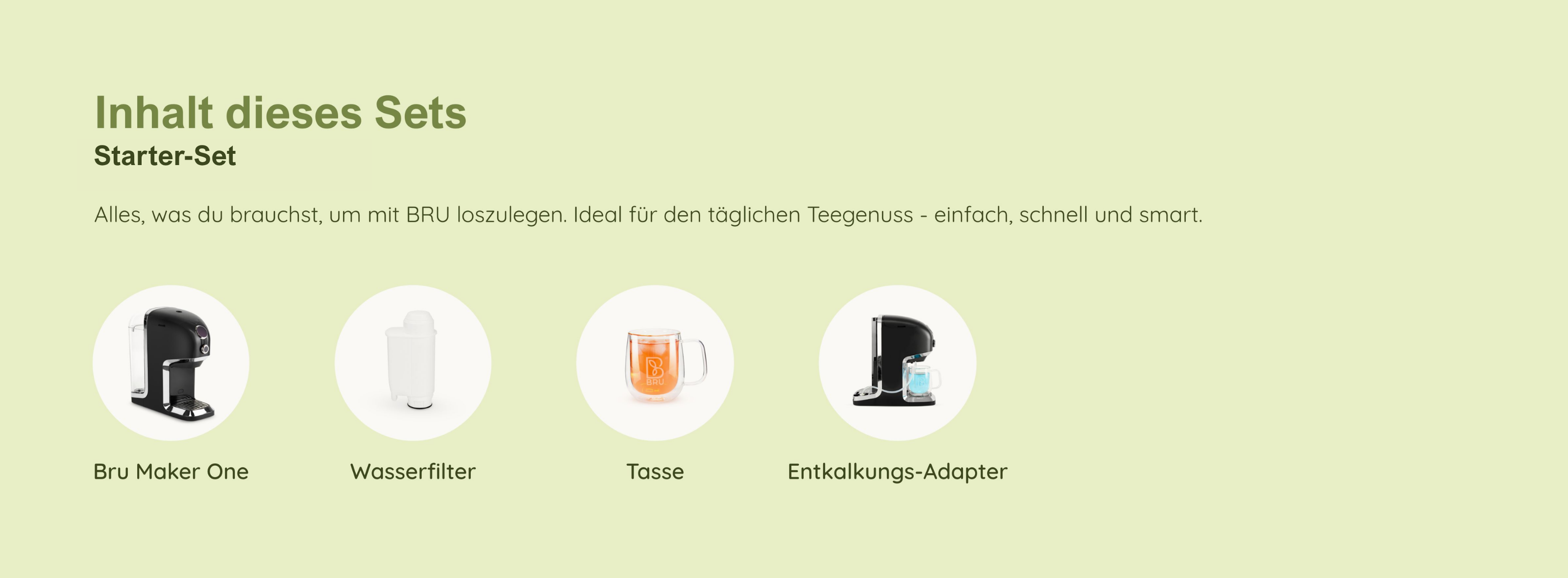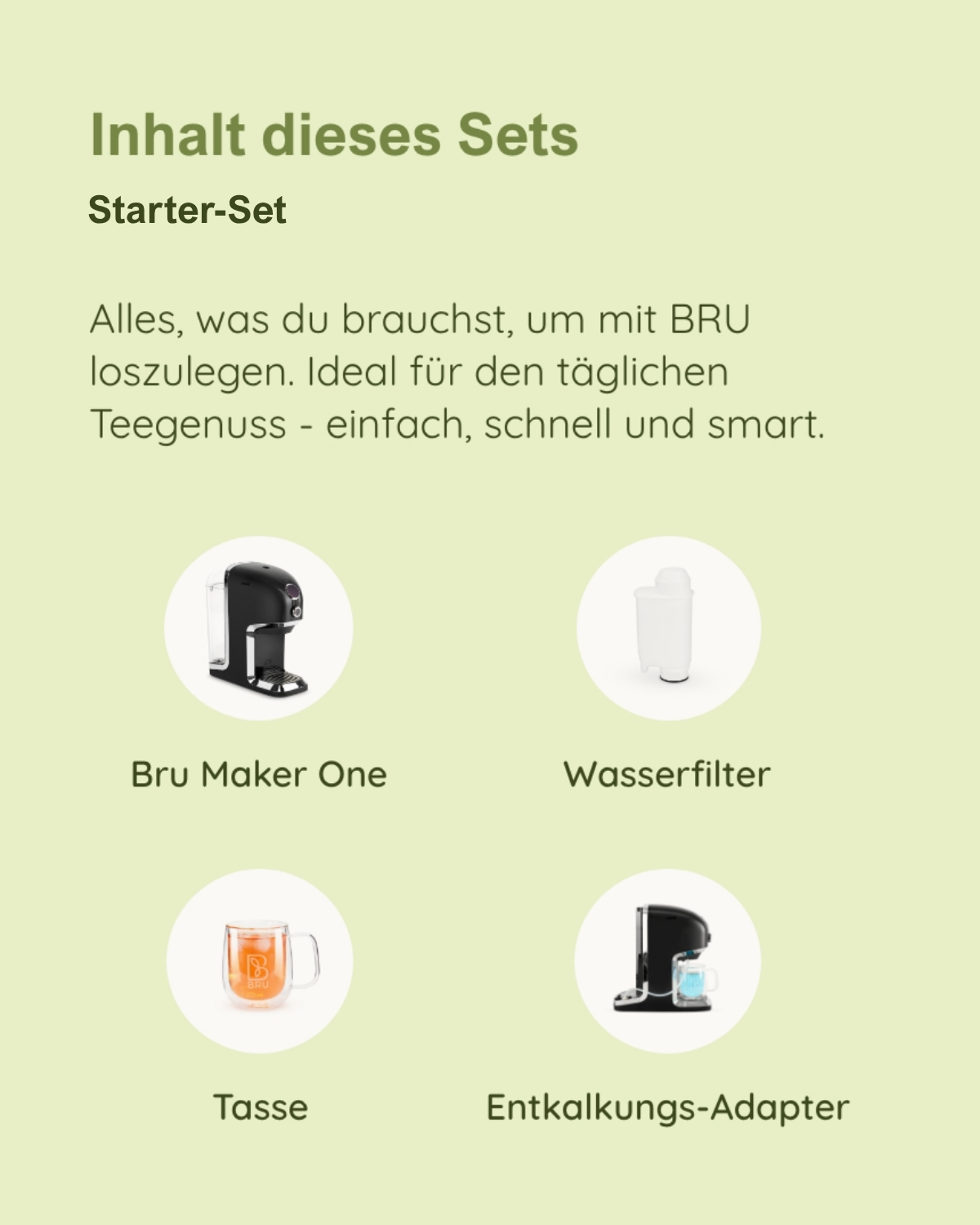 Dieses Set beinhaltet die Teemaschine + Filter + Tasse und Entkalkungsadapter.