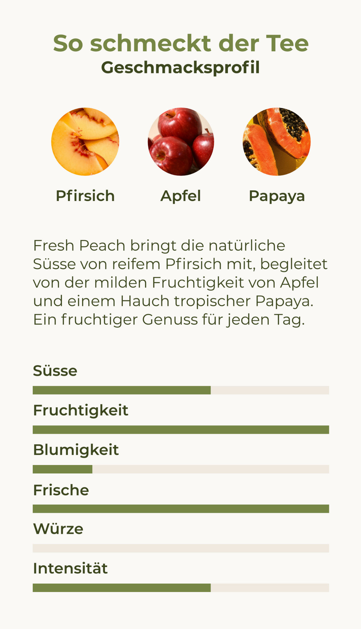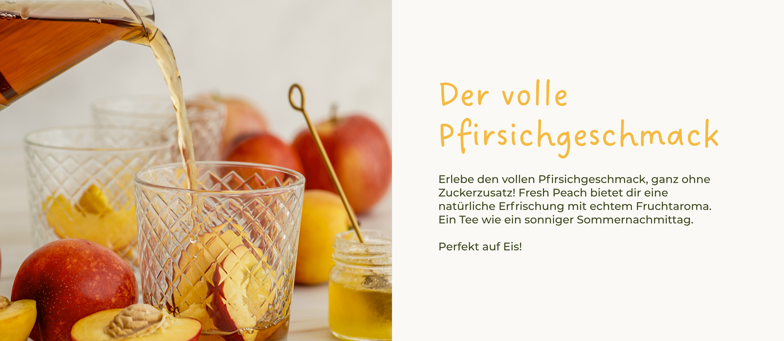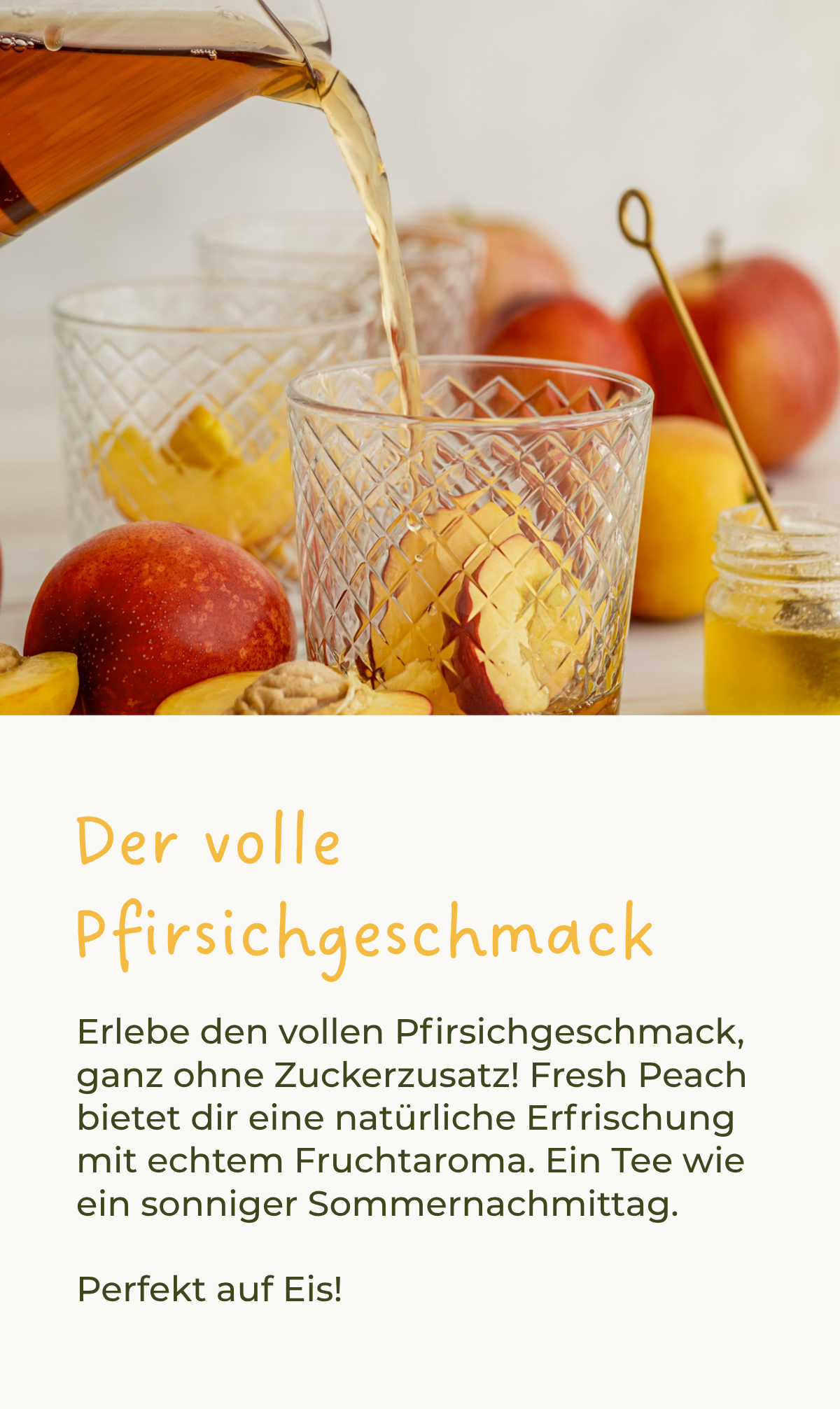 Erlebe den maximalen Pfirsichgenuss: unser Früchtetee Pfirsich mit fruchtig, frischem Geschmack von Pfirsich, Ananas, Mango und Passionsfrucht. Einfach lecker!