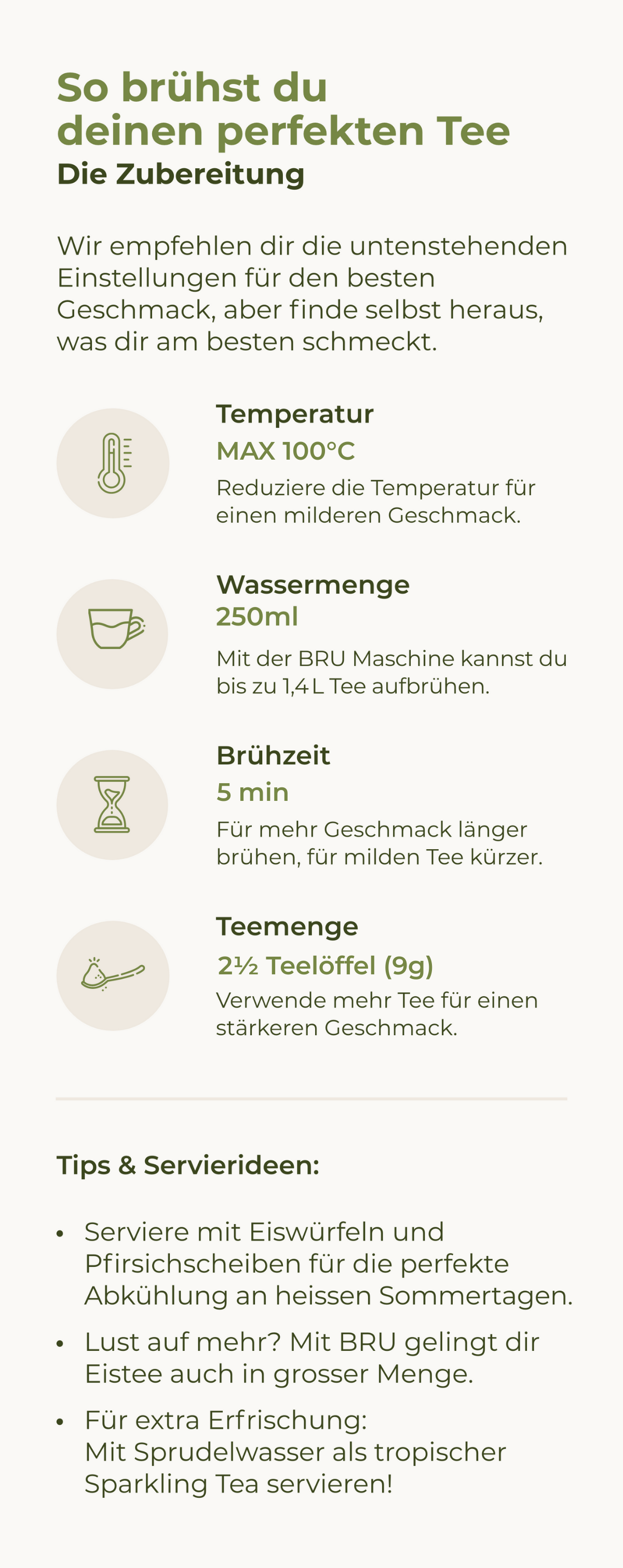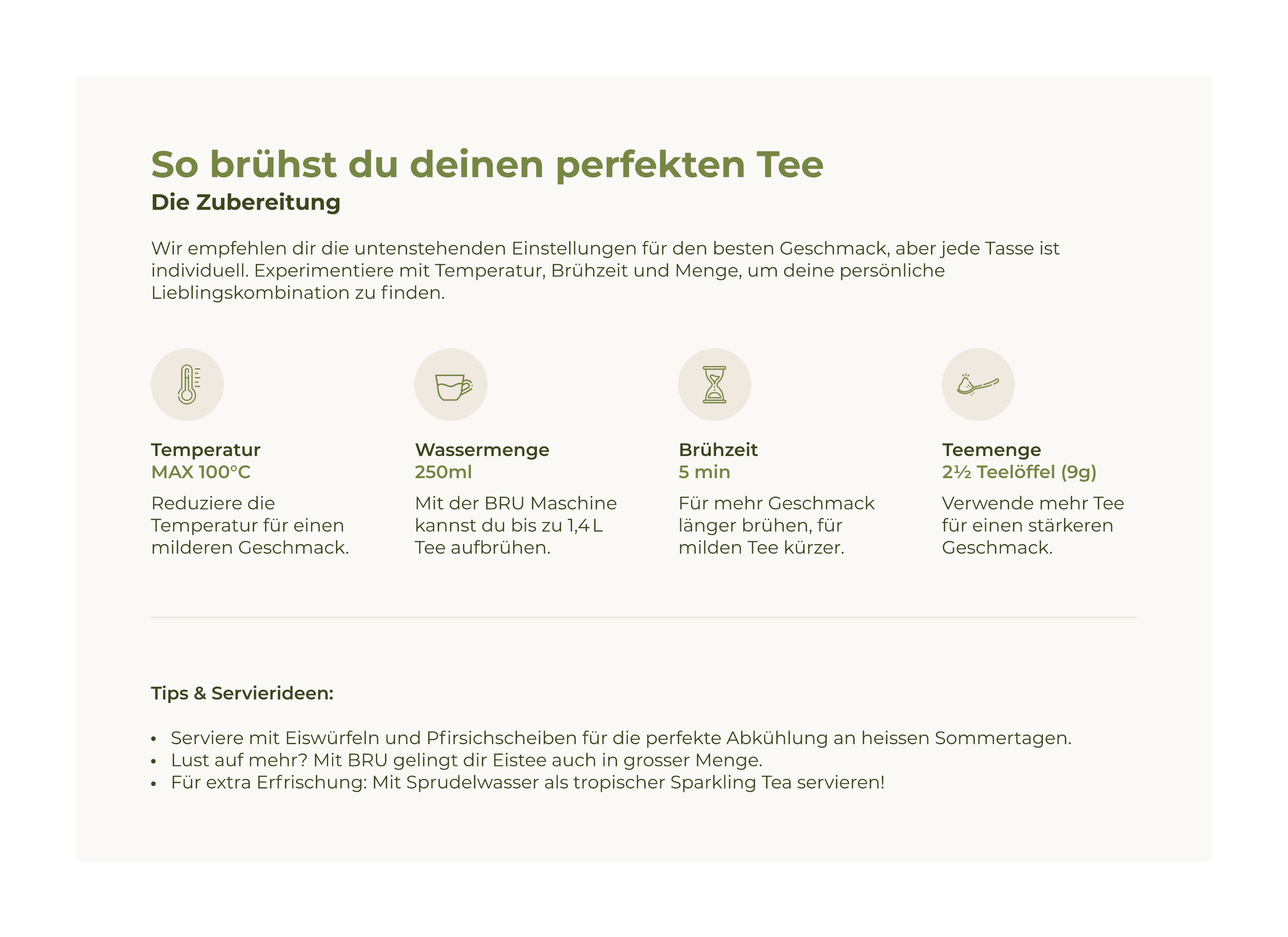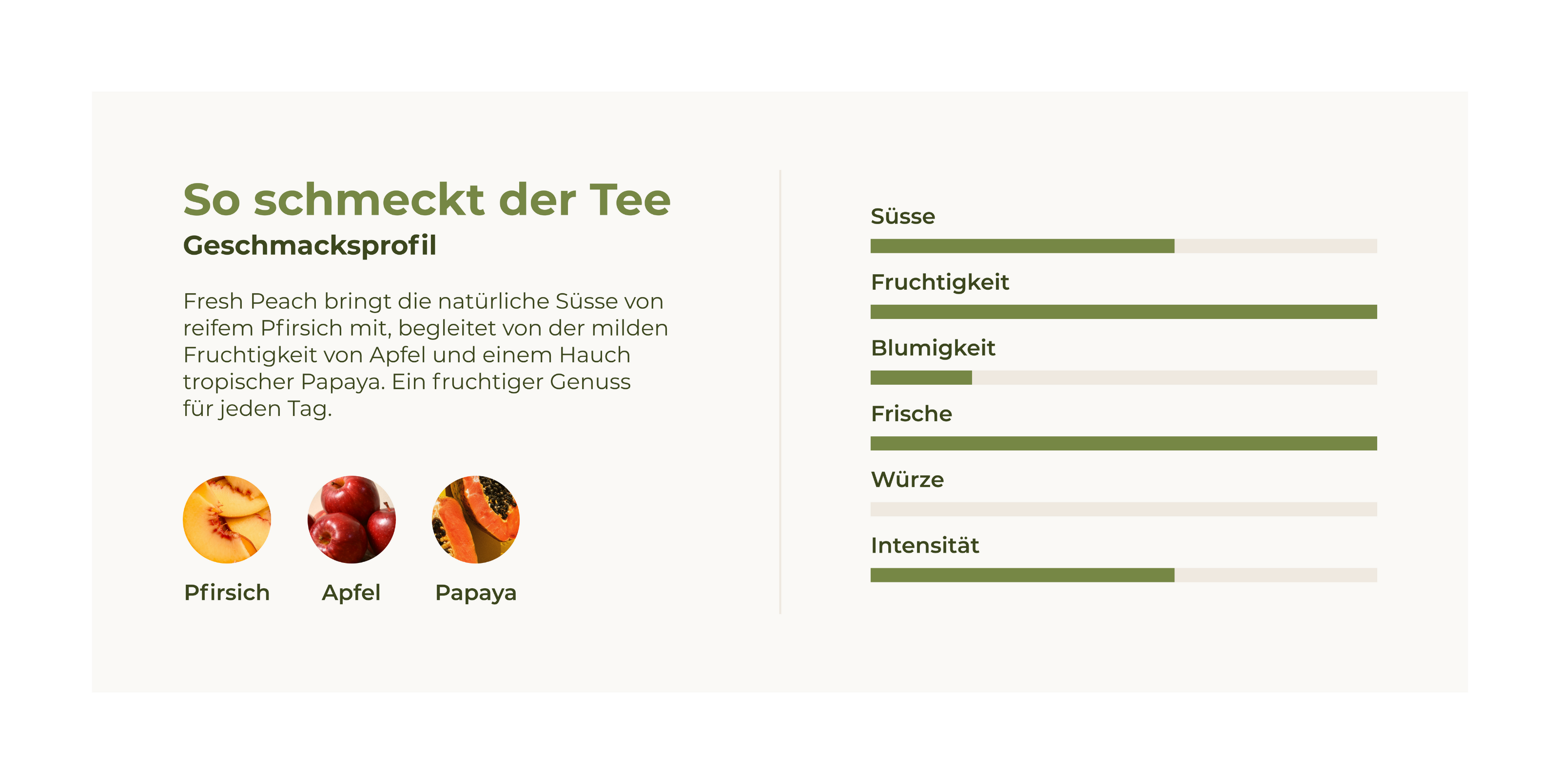 Erlebe den maximalen Pfirsichgenuss: unser Früchtetee Pfirsich mit fruchtig, frischem Geschmack von Pfirsich, Ananas, Mango und Passionsfrucht. Einfach lecker!