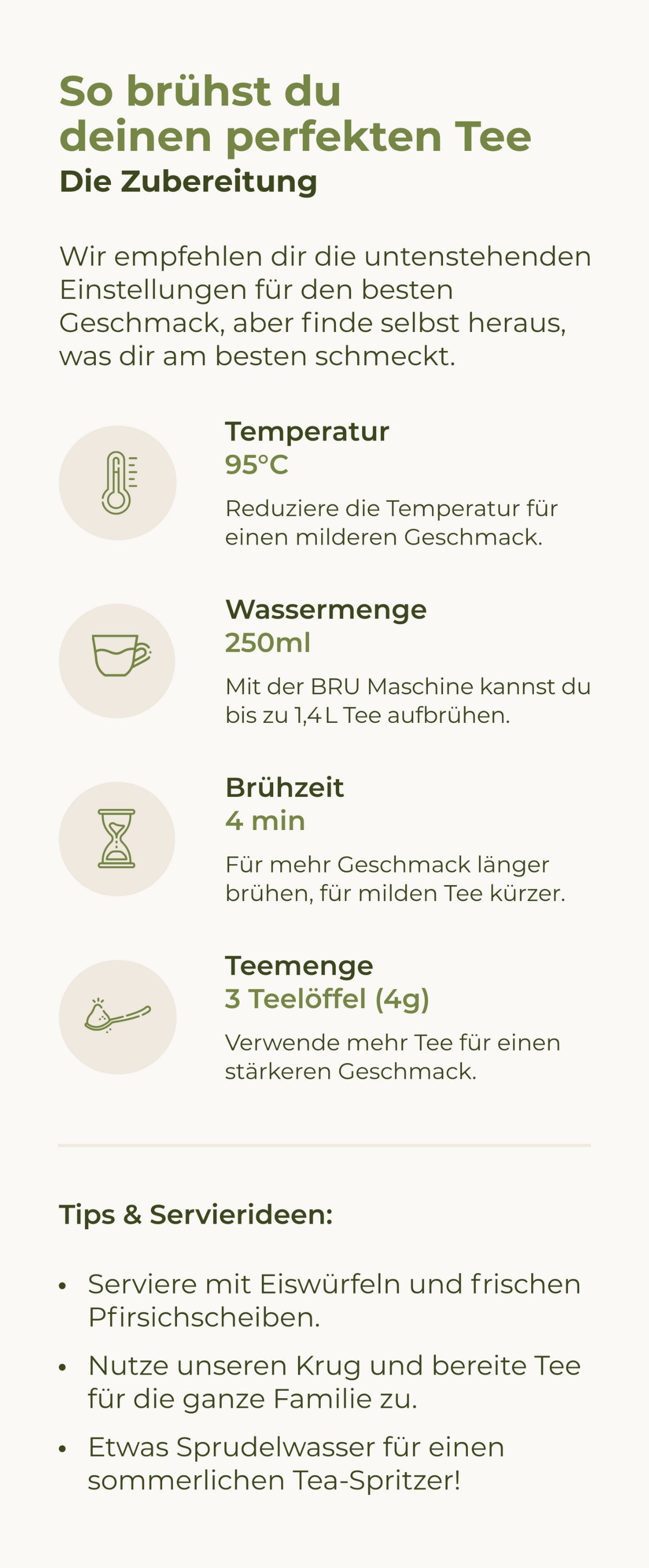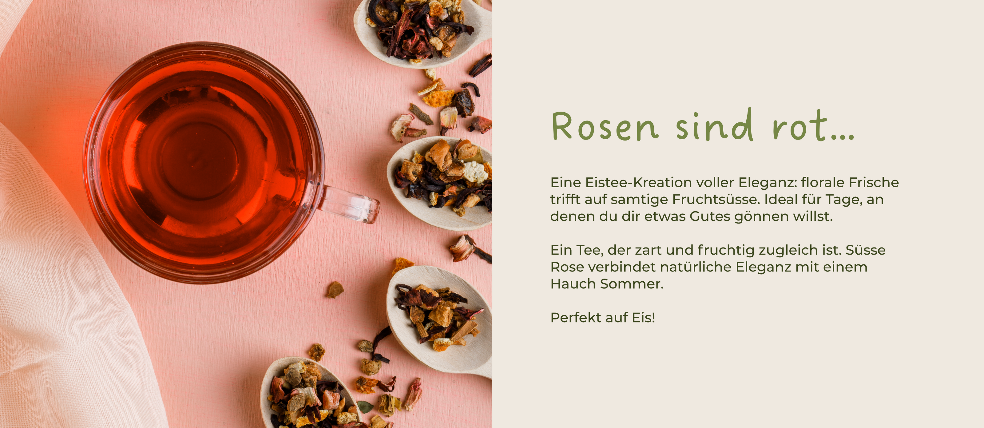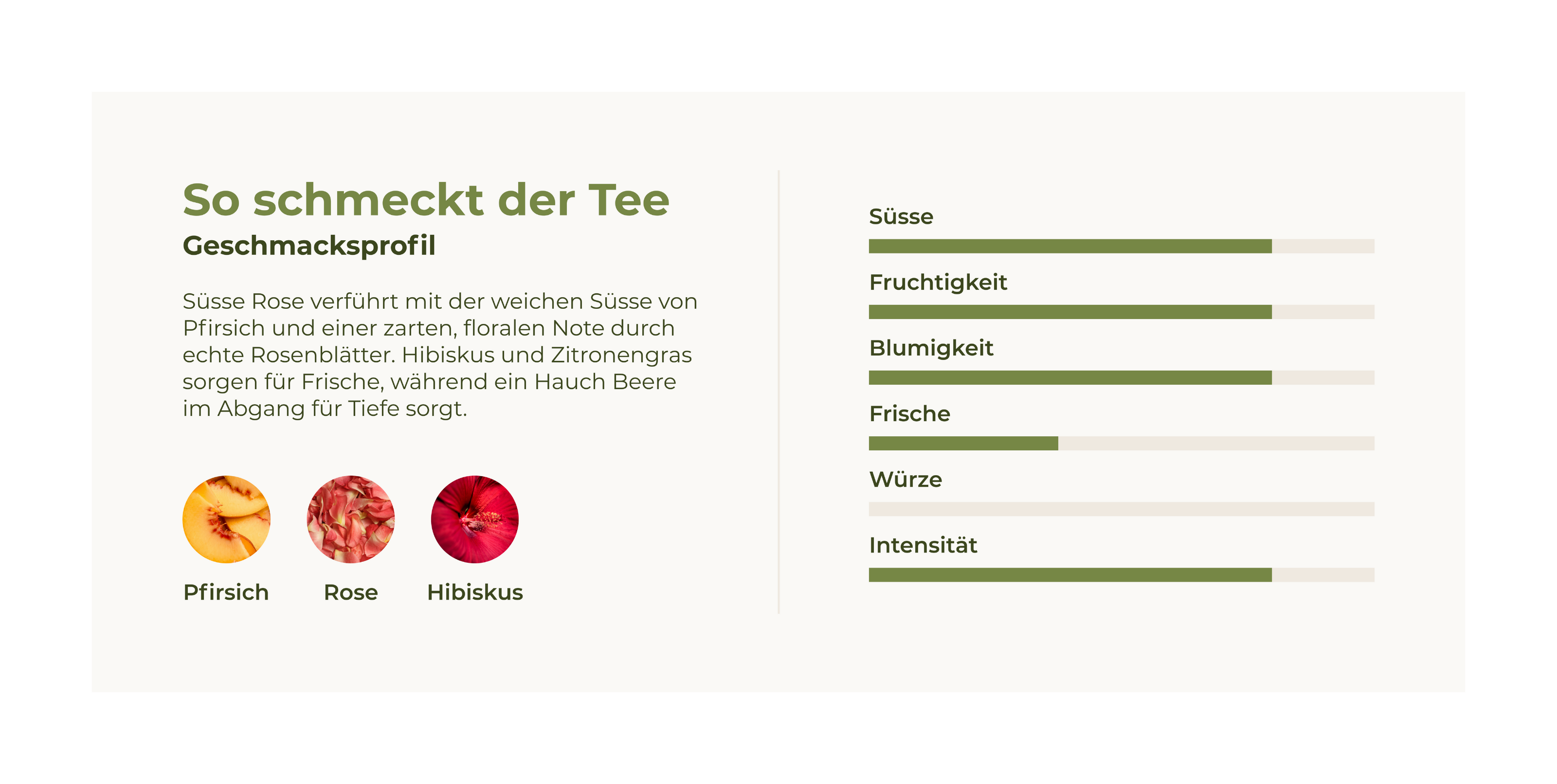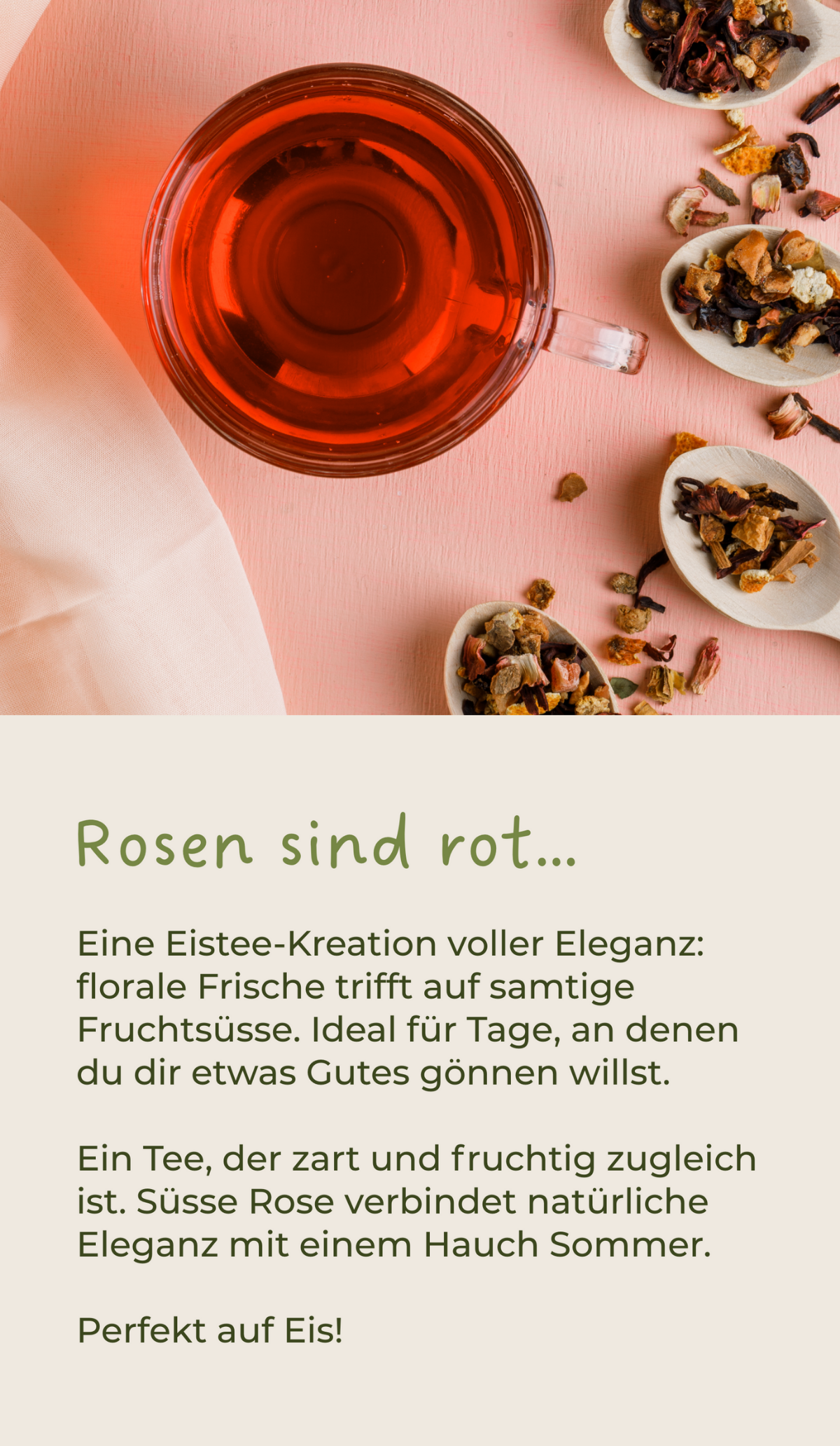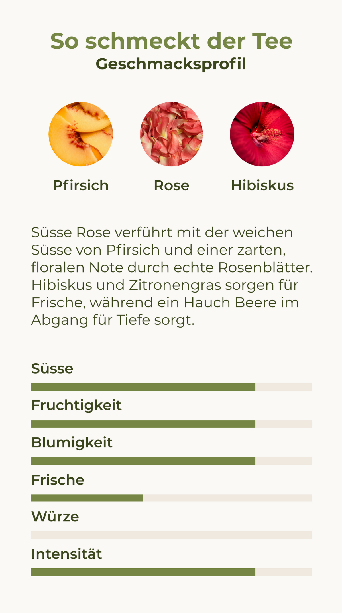 Tauche ein in die sanfte Welt von Süsse(r) Rose, einem feinen Früchtetee mit sonnenverwöhnten Pfirsichen, zarter Hibiskusblüte und echten Rosenblättern. Ein Hauch Exotik, ein Spritzer Sommer, serviert auf Eis oder warm genossen.