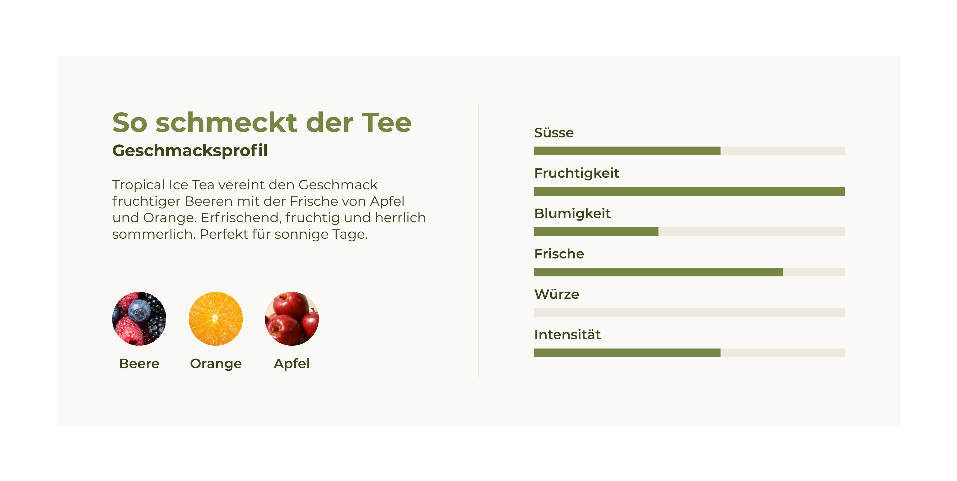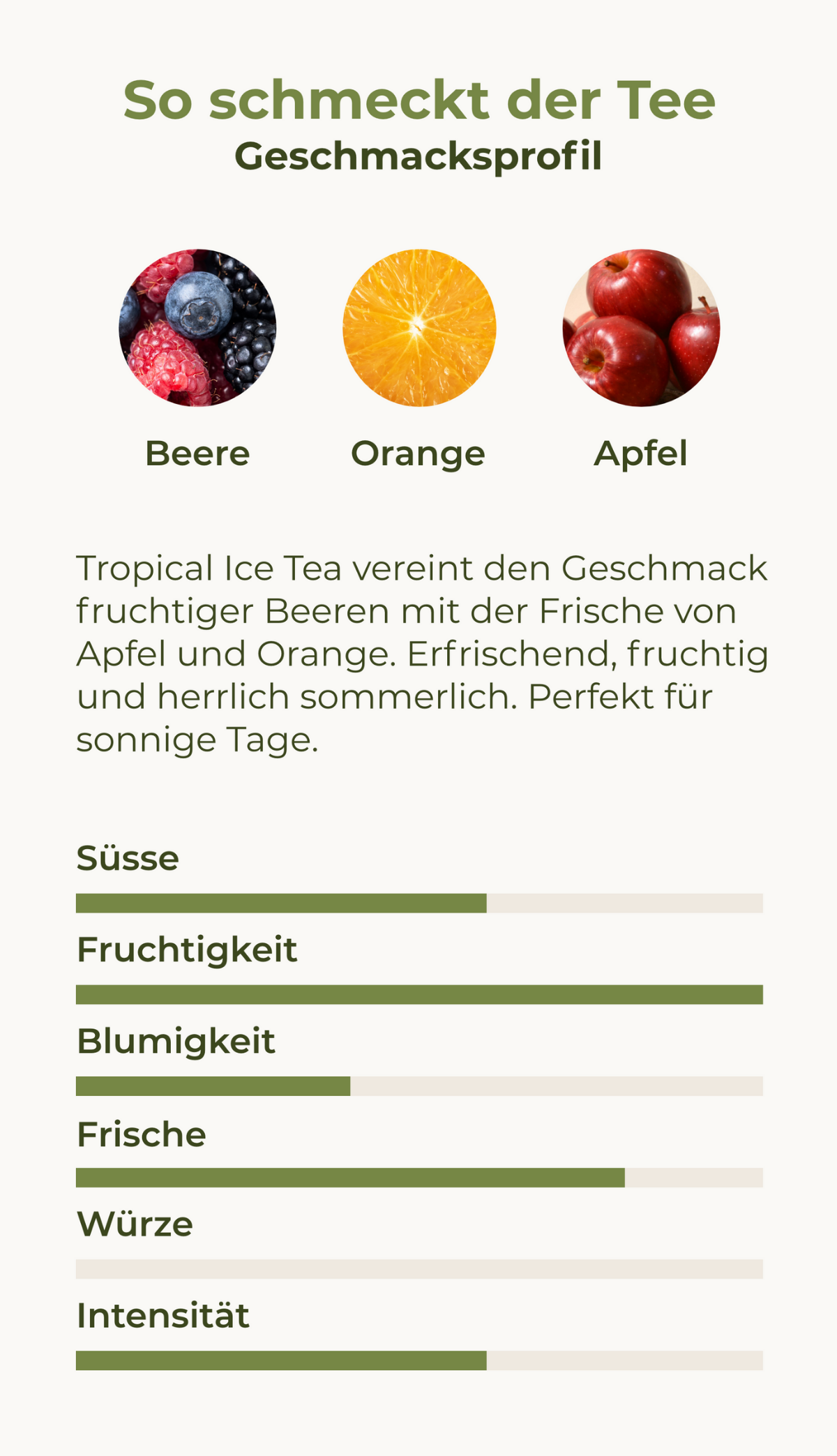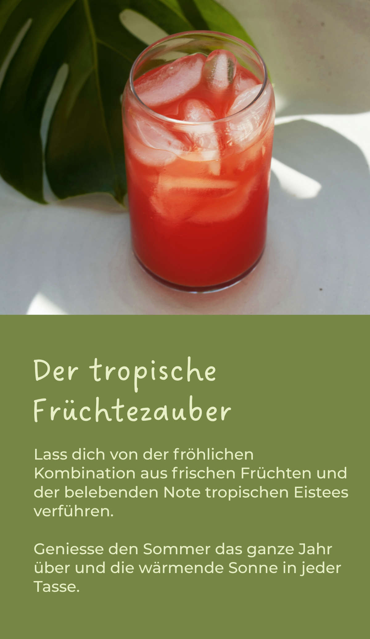 Entdecke unsere exotische Früchtetee-Mischung, mit dem Geschmack sonnengereifter Beeren und Orangen! Entecke ein tropisches Paradies und lass dich verwöhnen. Auch lecker, wenn auf Eis serviert!