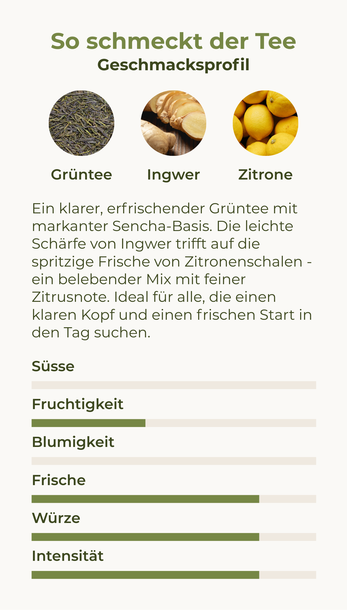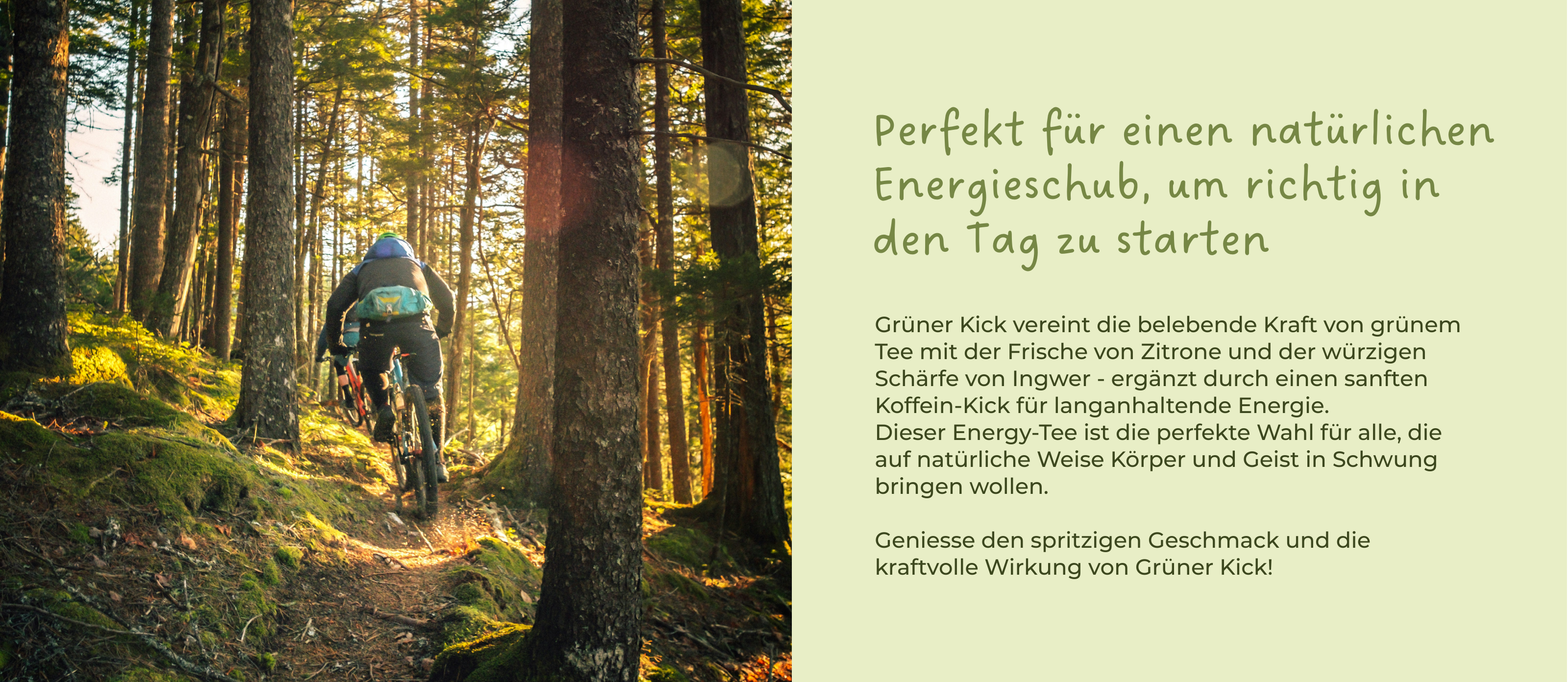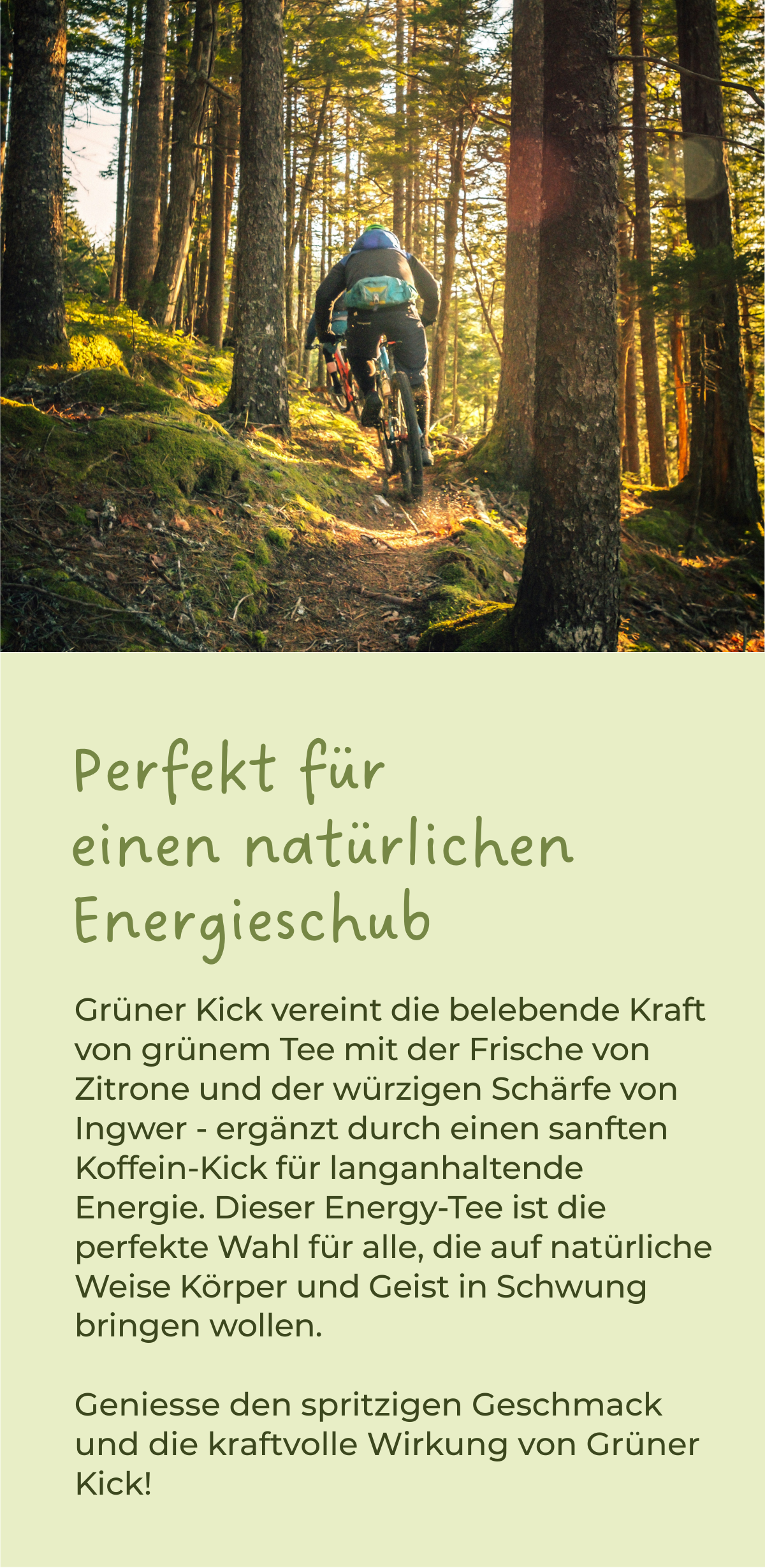 Grüner Kick vereint die belebende Kraft von grünem Tee mit der Frische von Zitrone und der würzigen Schärfe von Ingwer - ergänzt durch einen sanften Koffein-Kick für langanhaltende Energie. Dieser Energy-Tee ist die perfekte Wahl für alle, die auf natürliche Weise Körper und Geist in Schwung bringen wollen. Geniesse den spritzigen Geschmack.