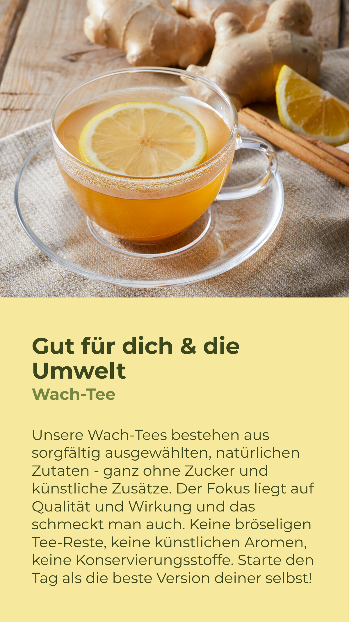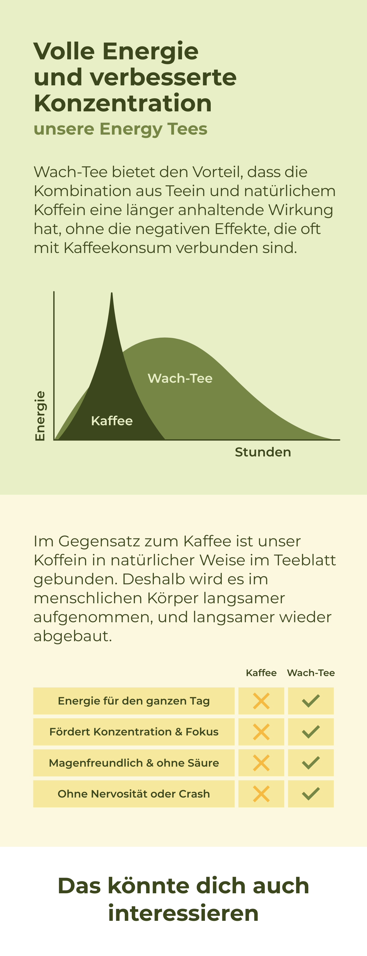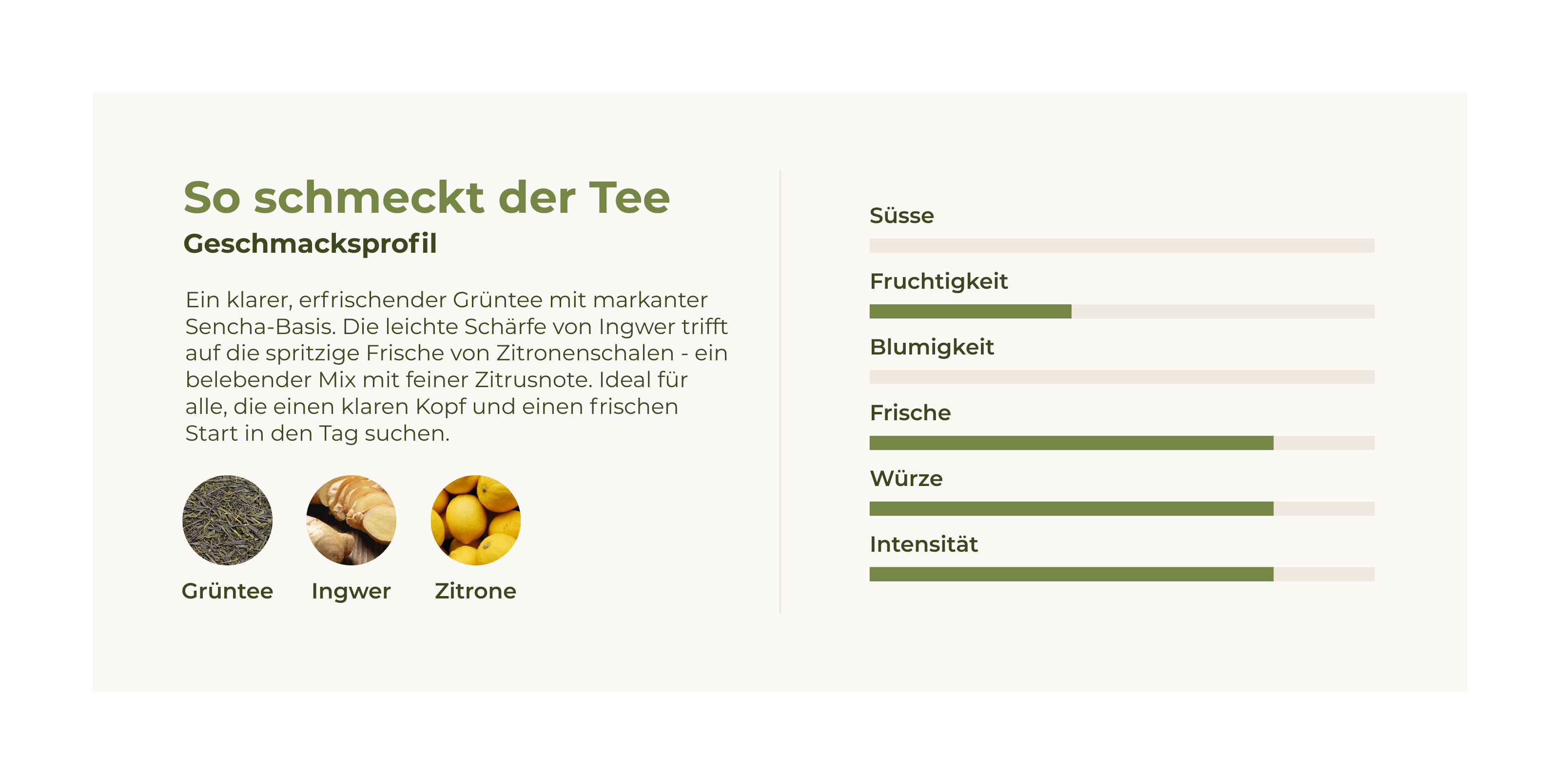 Grüner Kick vereint die belebende Kraft von grünem Tee mit der Frische von Zitrone und der würzigen Schärfe von Ingwer - ergänzt durch einen sanften Koffein-Kick für langanhaltende Energie. Dieser Energy-Tee ist die perfekte Wahl für alle, die auf natürliche Weise Körper und Geist in Schwung bringen wollen. Geniesse den spritzigen Geschmack.