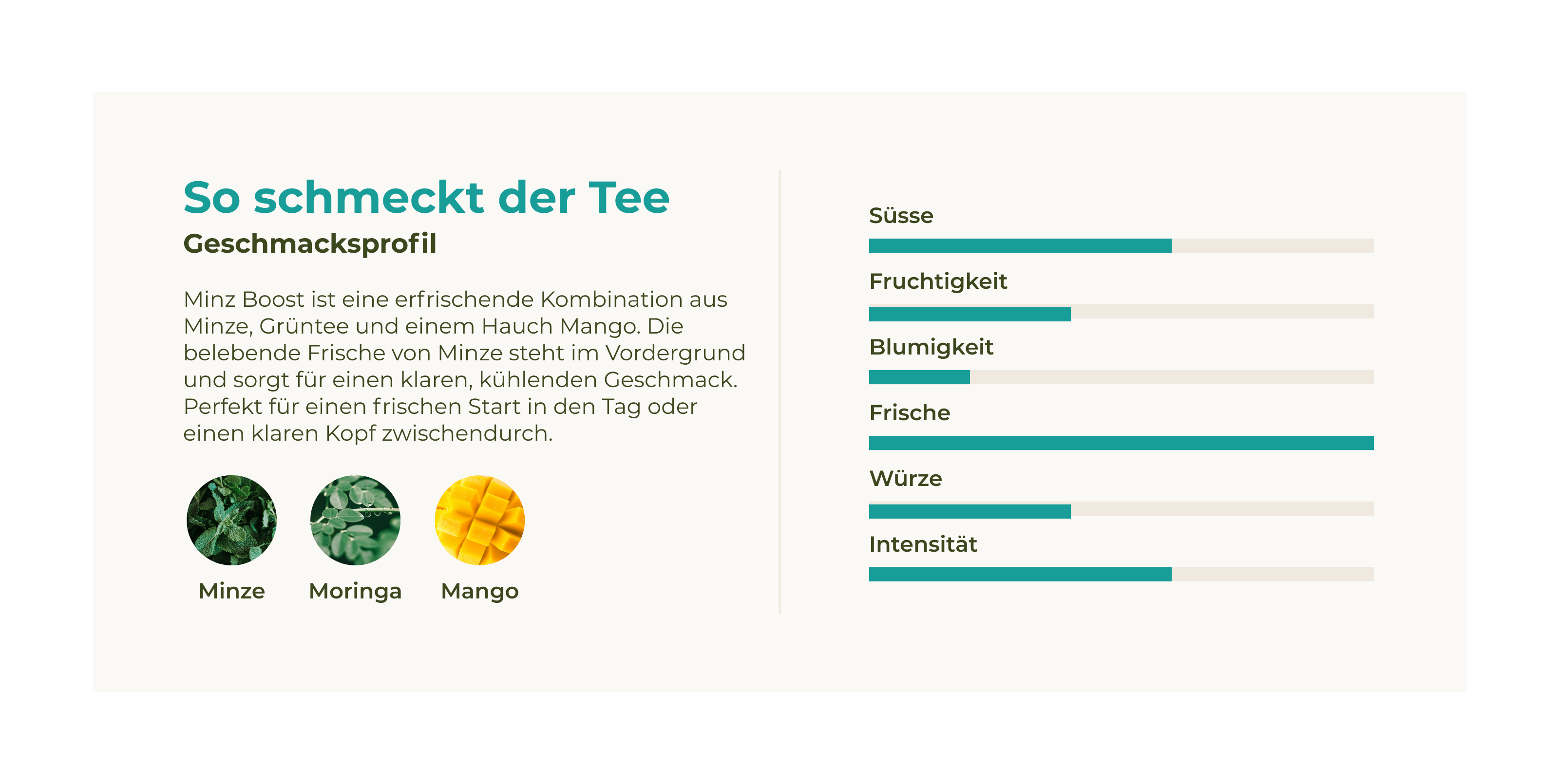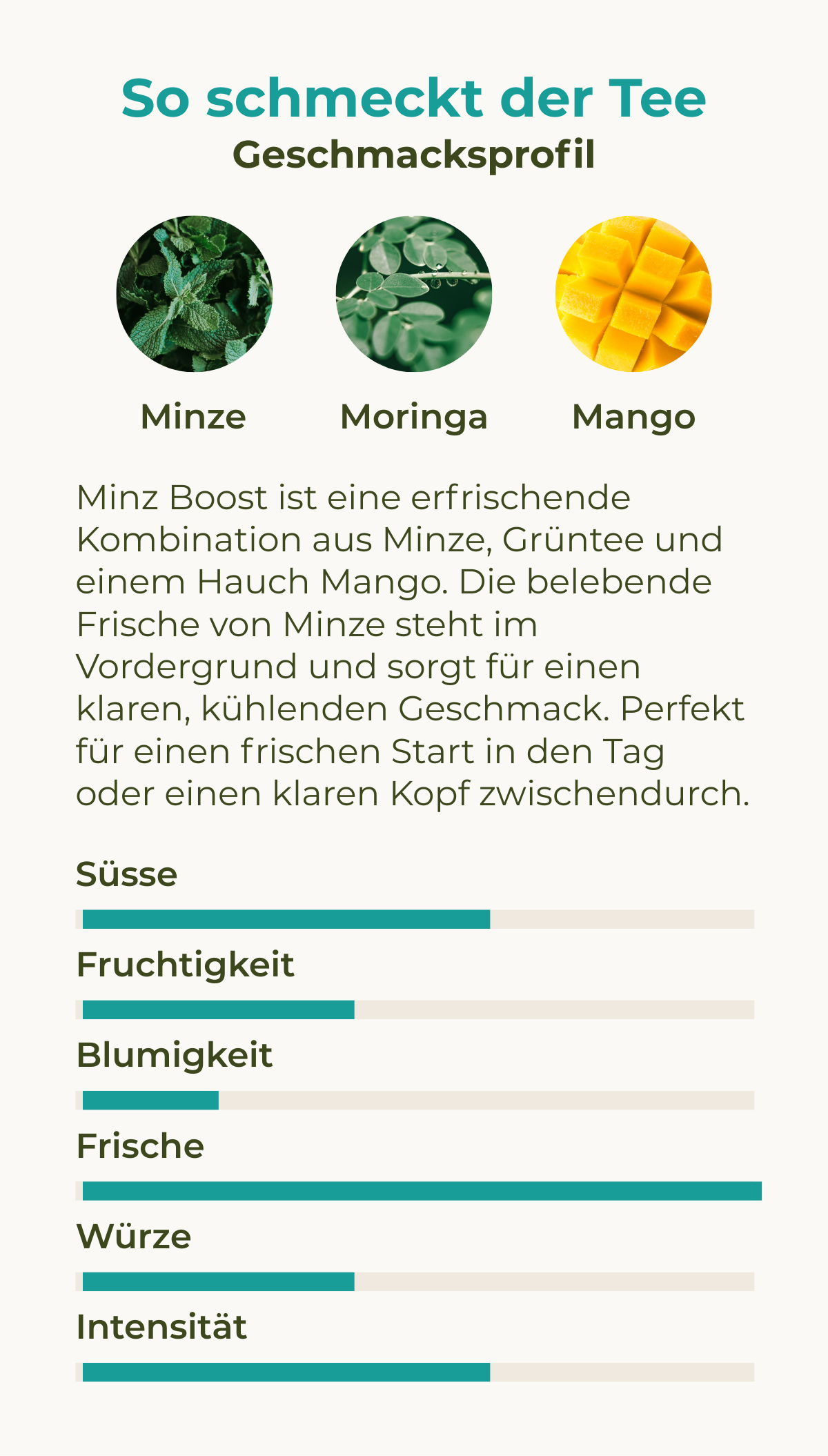 Entdecke Minz Boost, den ultimativen Energy-Tee für alle, die auf natürliche Weise neue Energie tanken möchten. Mit einem belebenden Mix aus erfrischender Minze, Moringa und dem sanften Kick von Koffein sorgt Minz Boost für einen langanhaltenden Energieschub.