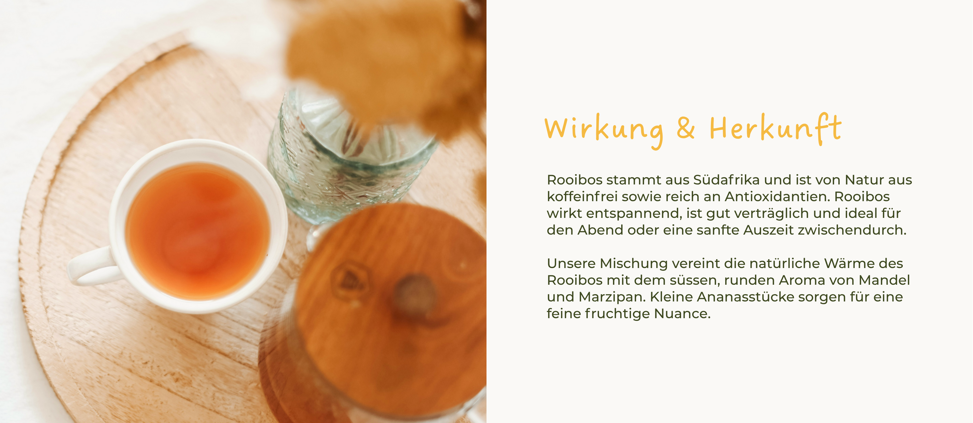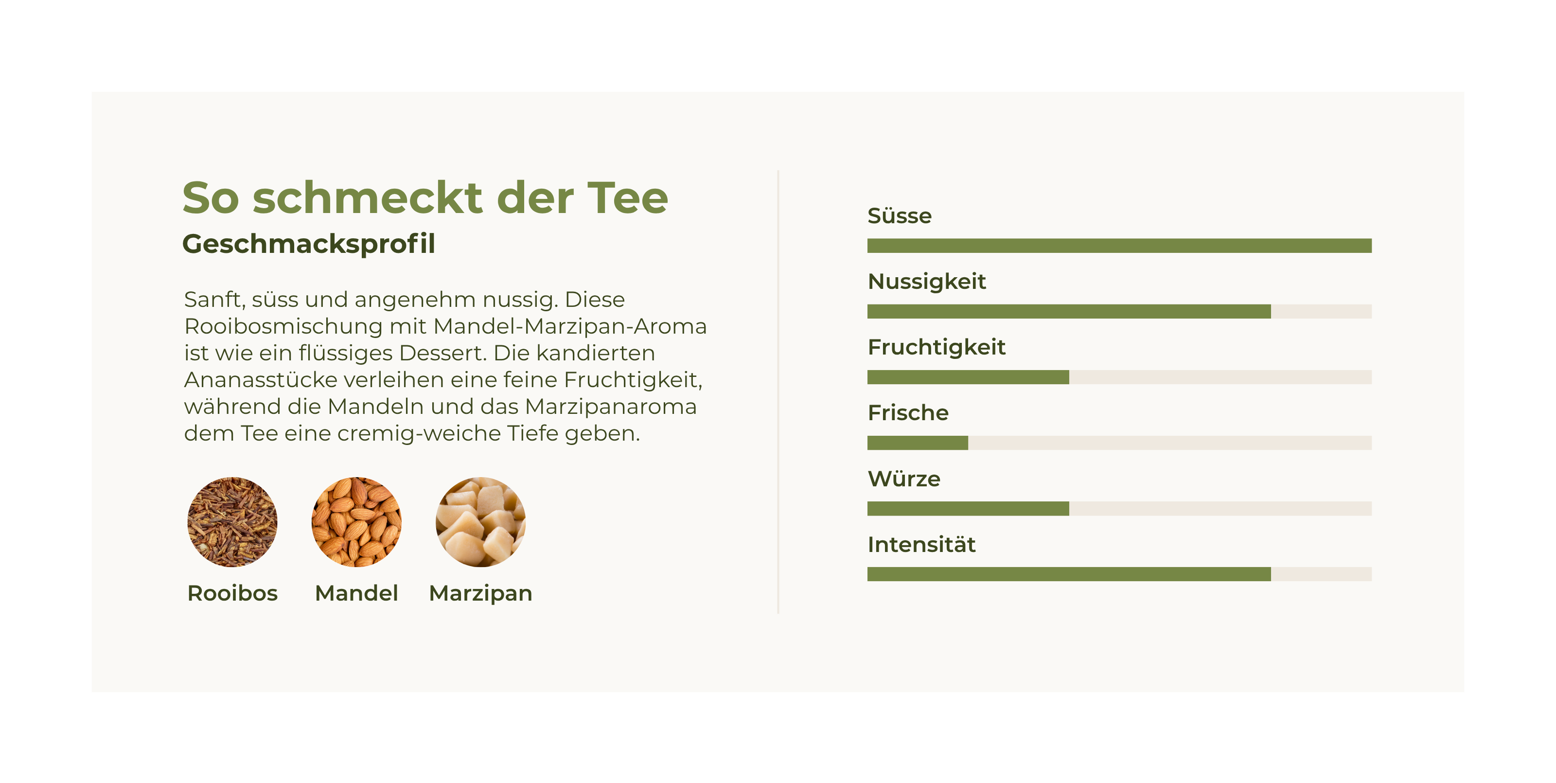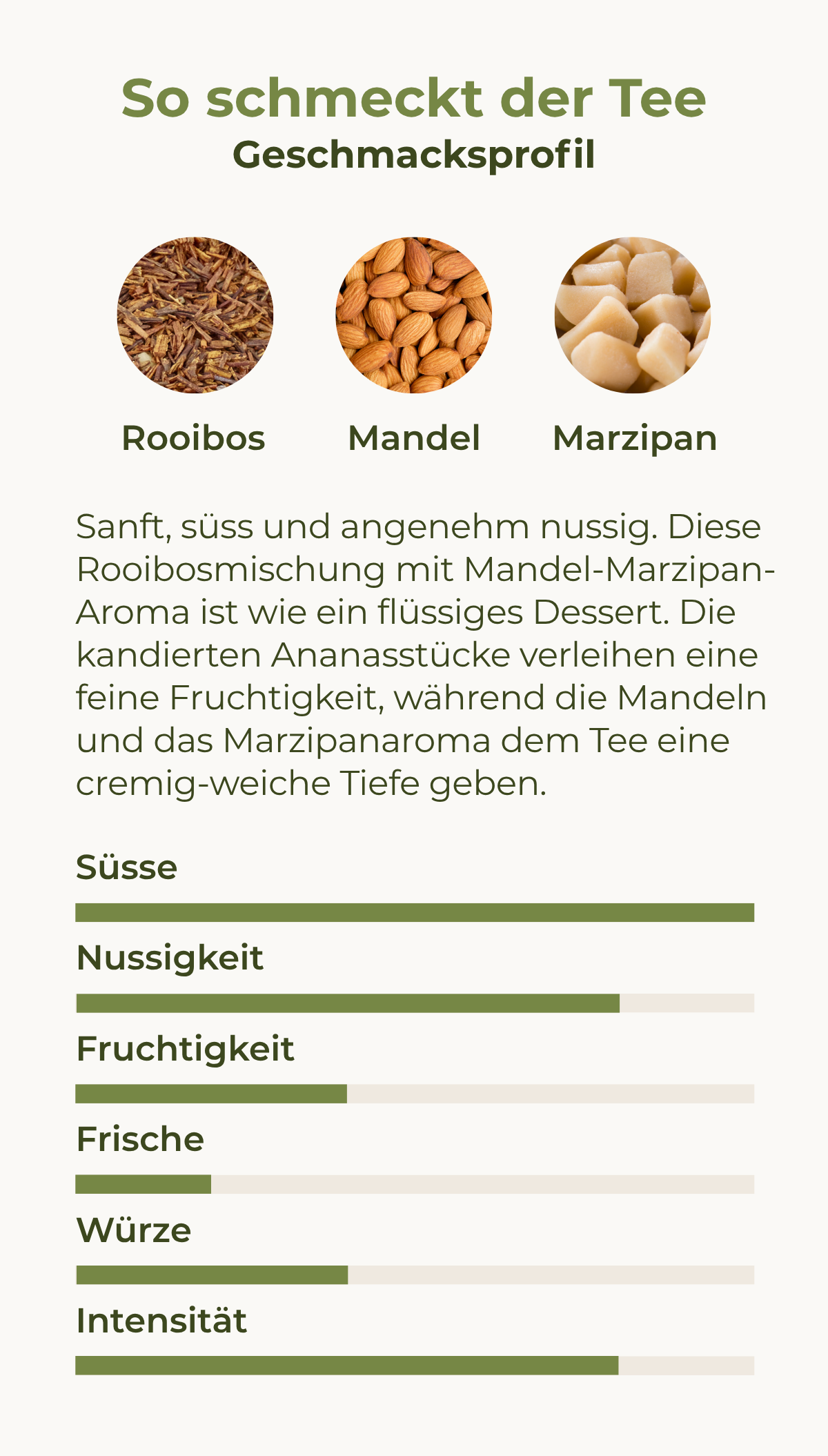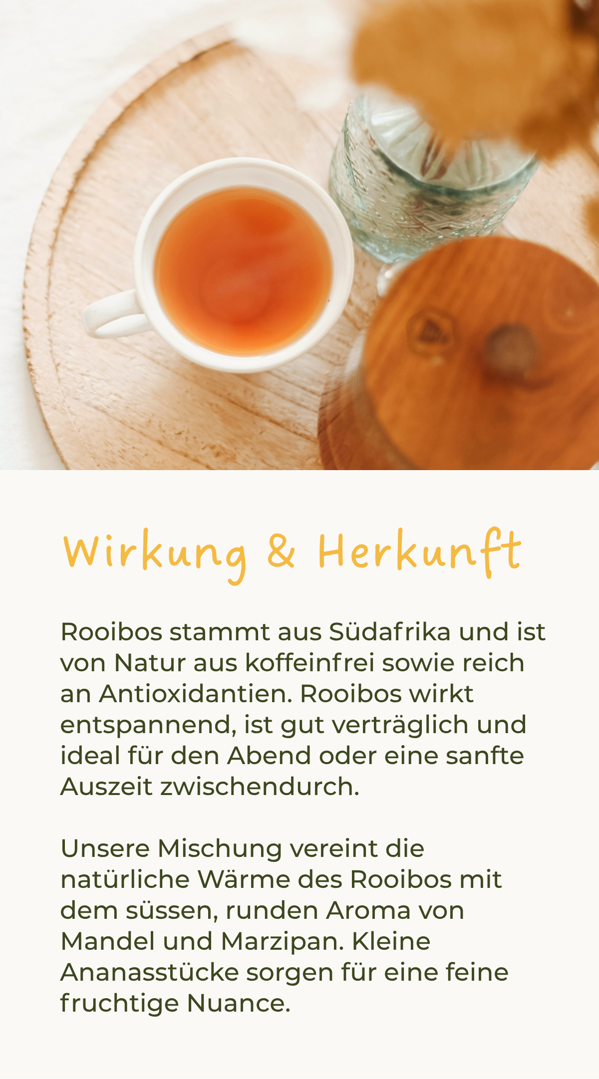 Tauche ein in die verlockende Welt des Rooibos-Tees, mit einem unwiderstehlichen Mandel-Aroma! Gönne dir eine Auszeit und genieße die beruhigende Wärme von Rooibos mit einem Hauch von süßem Marzipangeschmack.