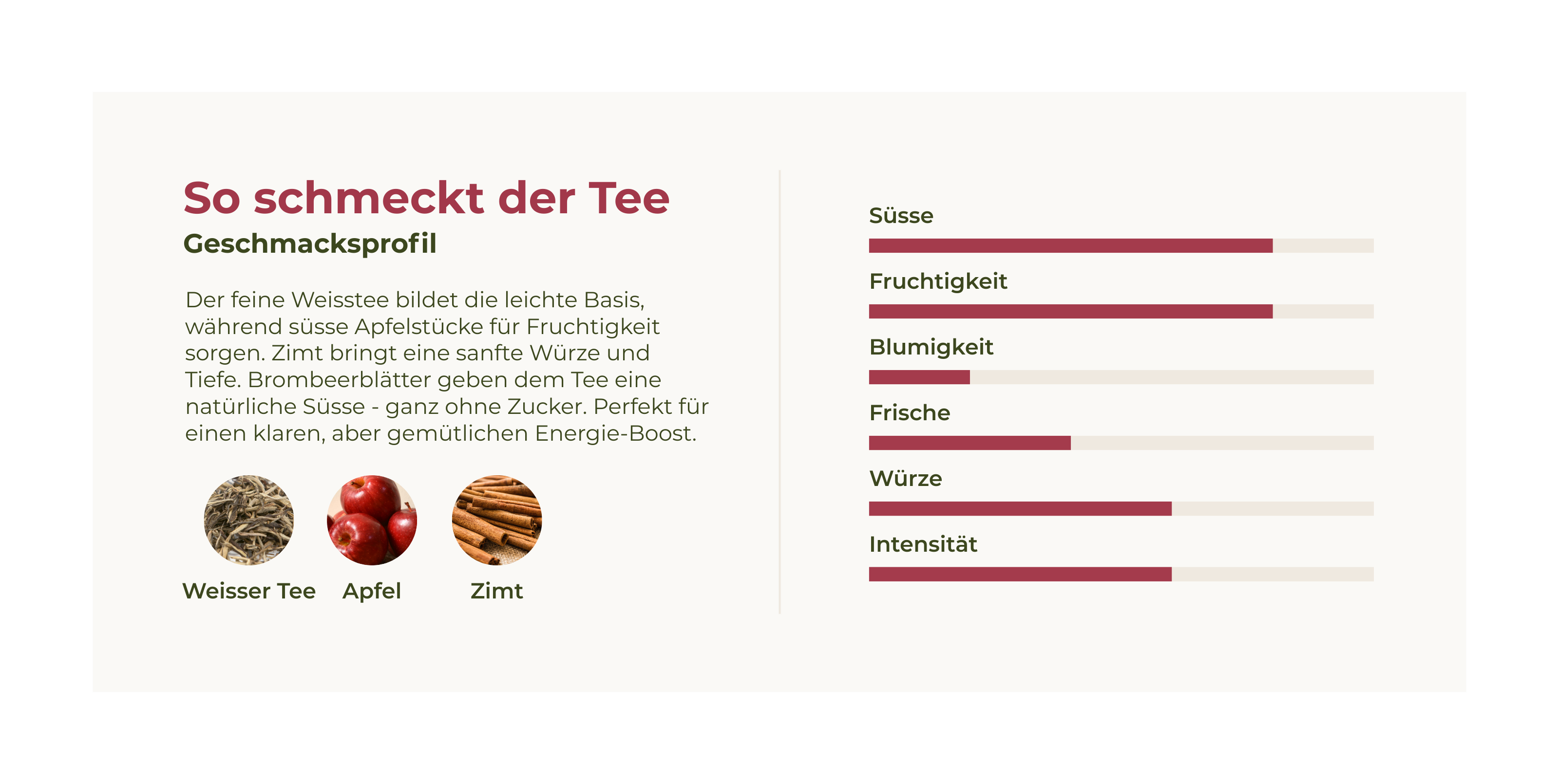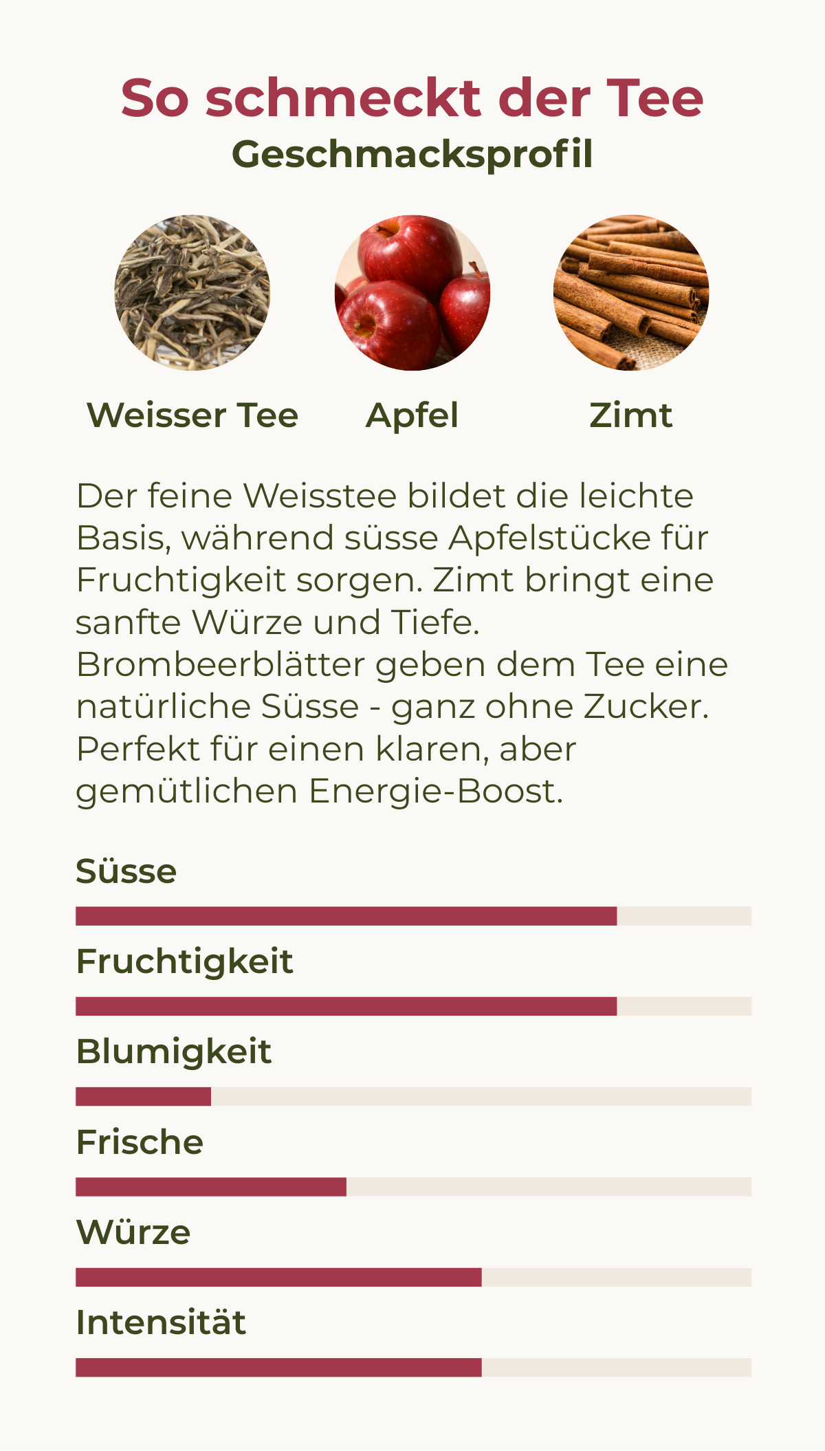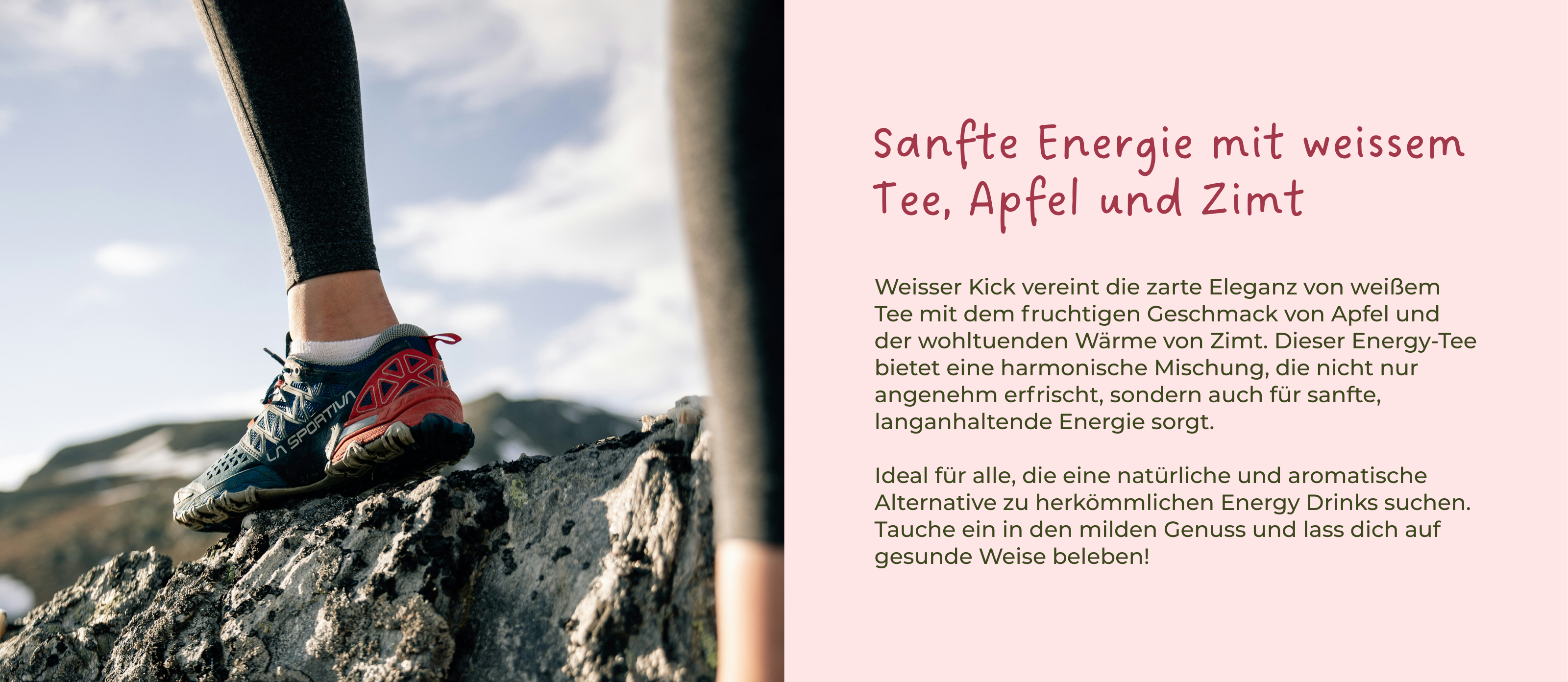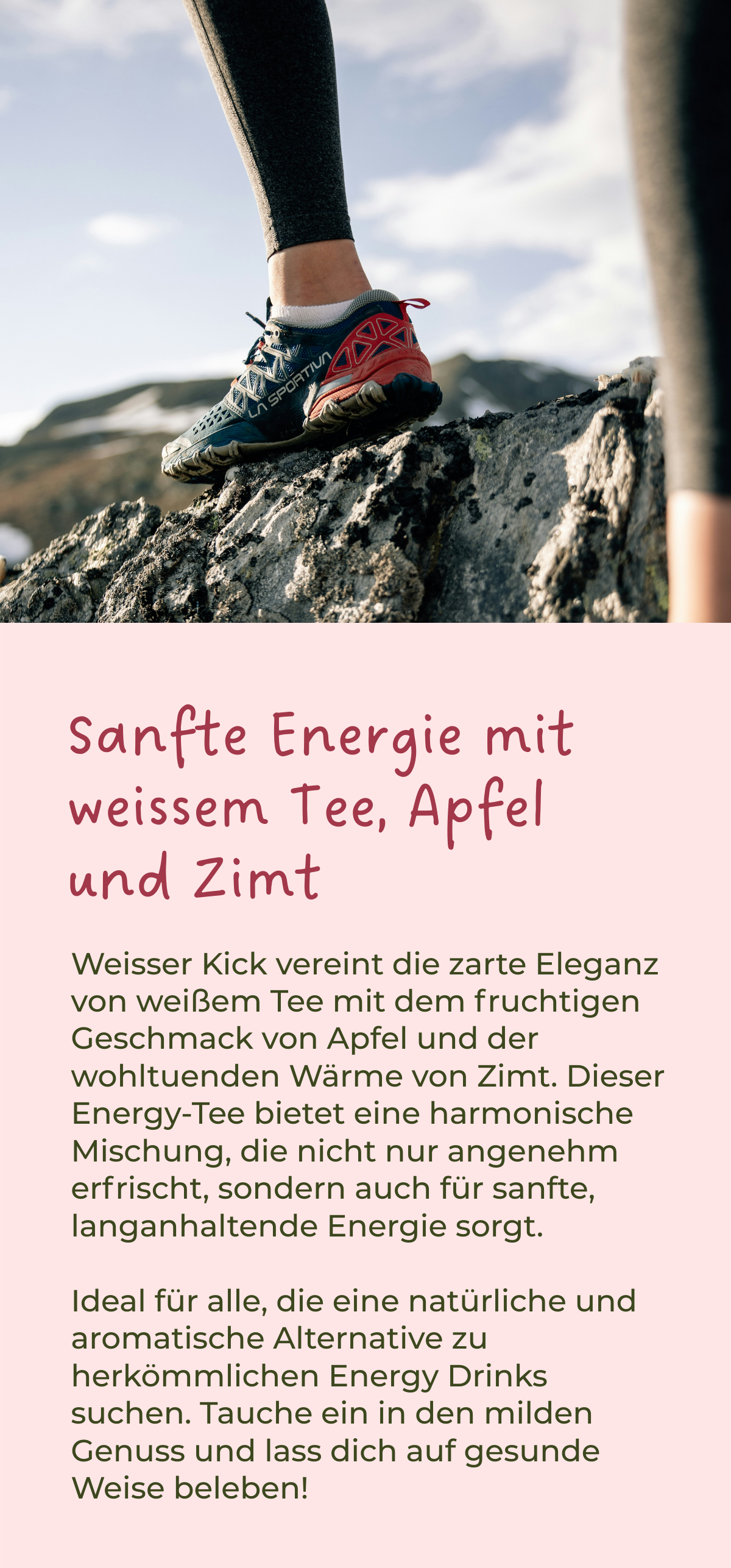 Weisser Kick vereint die zarte Eleganz von weissqem Tee mit dem fruchtigen Geschmack von Apfel und der wohltuenden Wärme von Zimt. Dieser Energy Tea bietet eine harmonische Mischung, die nicht nur angenehm erfrischt, sondern auch für sanfte, langanhaltende Energie sorgt. Ideal für alle, die eine natürliche und aromatische Alternative zu herkömmlichen Energy Drinks suchen.